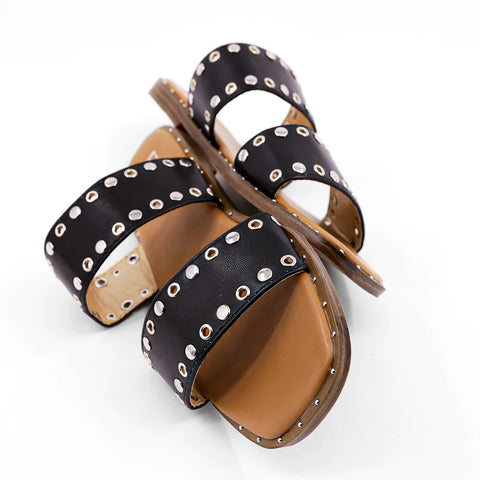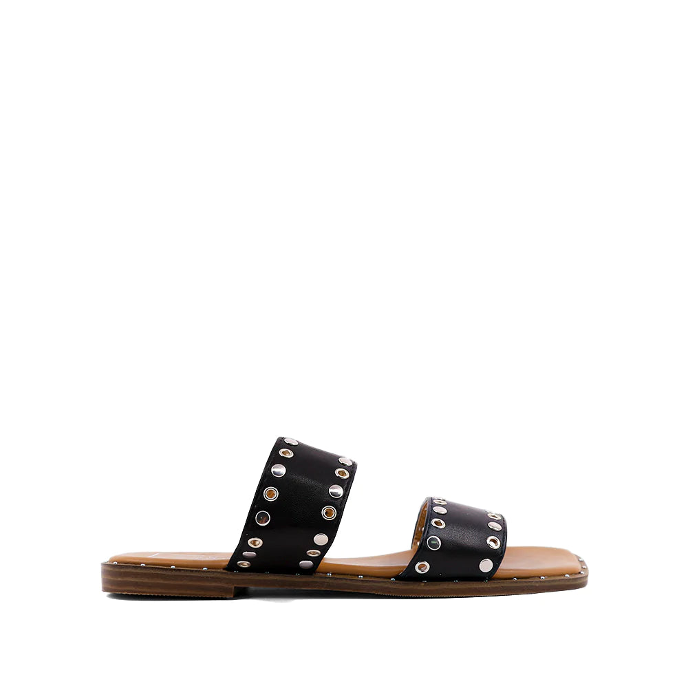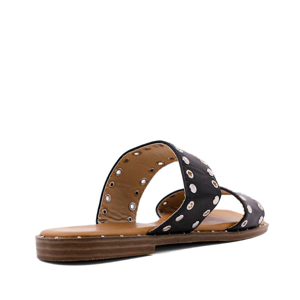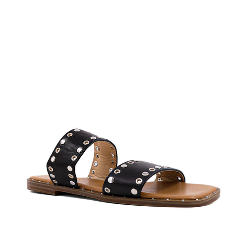 AMBAR's double straps sprinkled with round metallic studs appear strikingly simple, but will complement everything you choose from jeans to dresses.