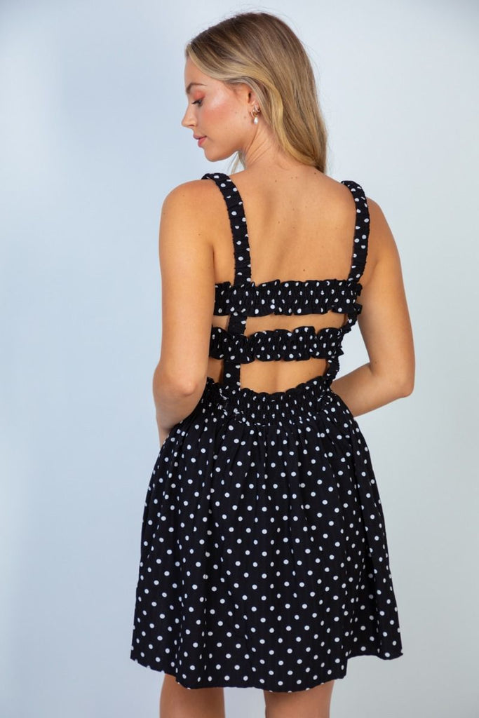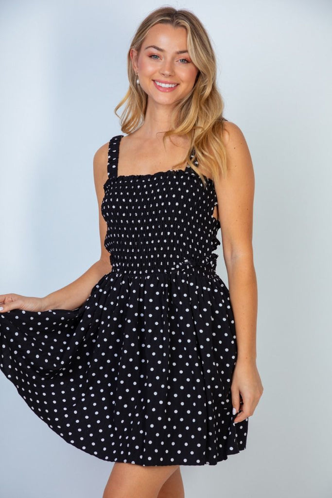 It's a polka-dot party in this little smocked dress! Slip into THE POLKA DOT DRESS by day or night and all eyes will be on you. With its lightweight fabric and strappy back, this BLACK SMOCKED A sleeveless ensemble will have you dotty for its dashing dotty style. Dance the night away in true polka dot fashion!