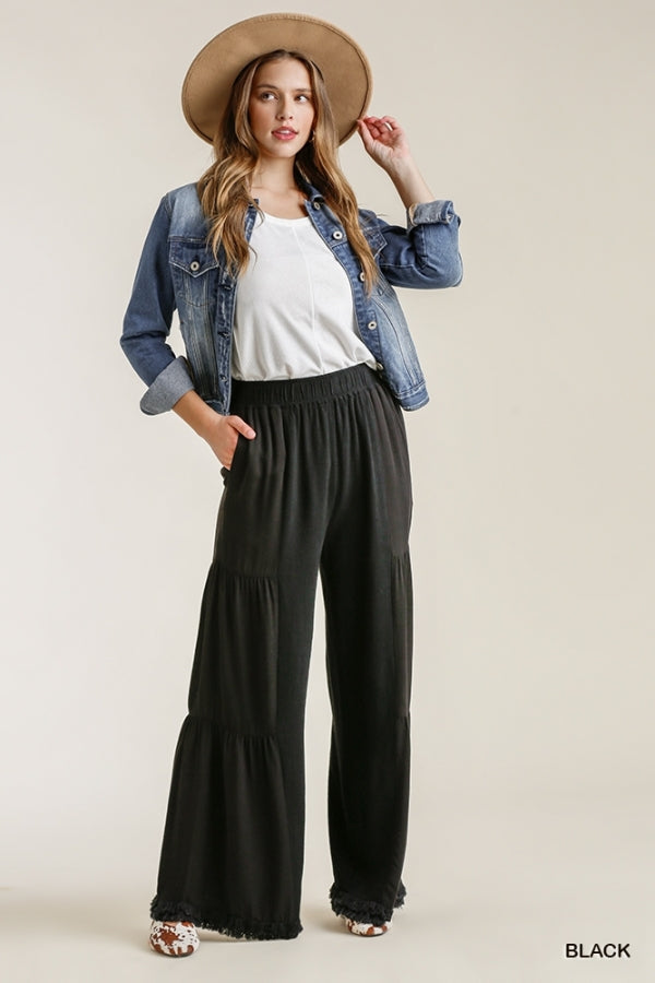 Linen Blend Side Tiered Elastic Waist Wide Leg Pants with Pockets and Frayed Hem