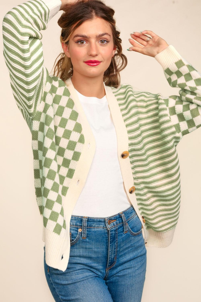 V NECK BUTTON DOWN LONG SLEEVE CHECKER STRIPE COLOR BLOCK LOOSE FIT OVERSIZED SWEATER CARDIGAN