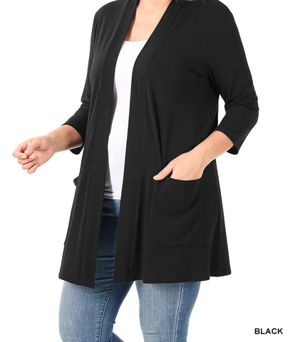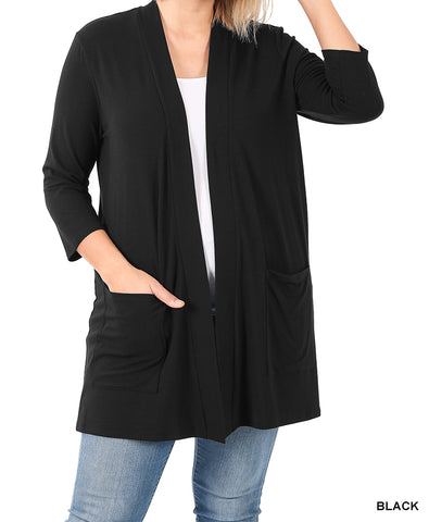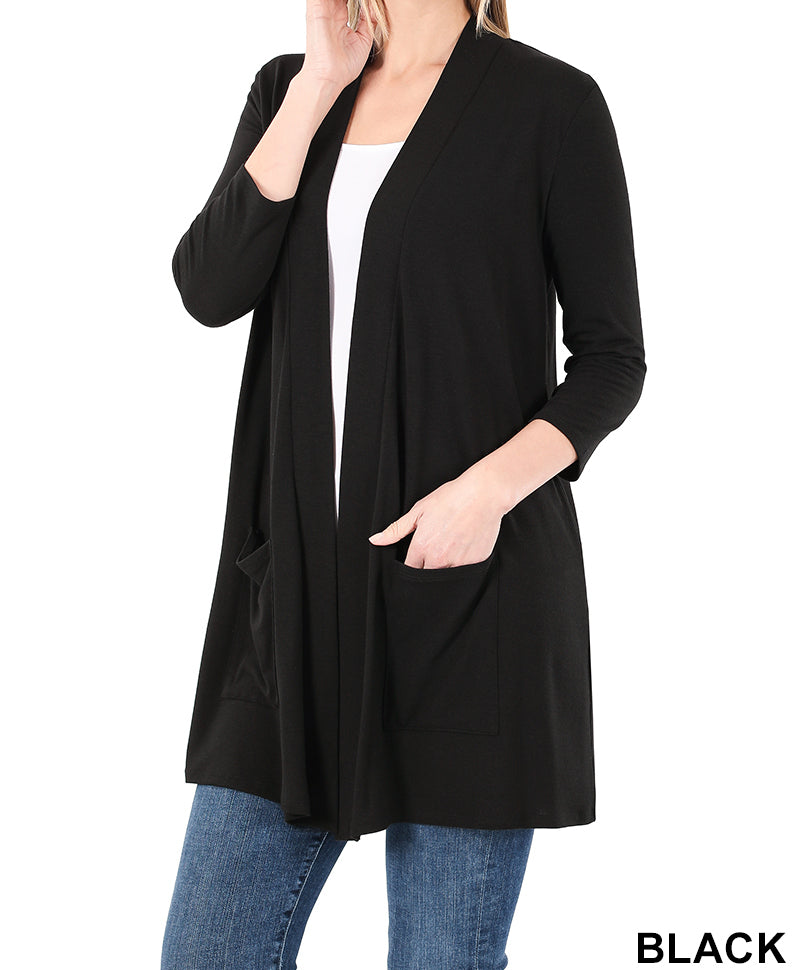 An excellent quality, stylish, and comfortable open front cardigan. Comes with pockets.