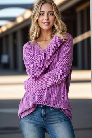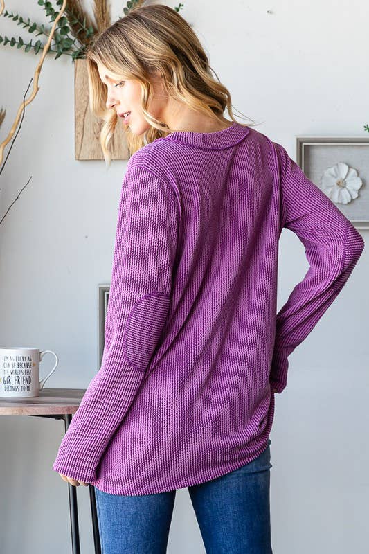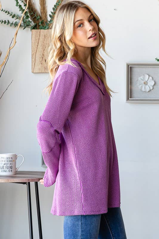 95% POLYESTER 5% SPANDEX LONG SLEEVE V NECK SOLID URBAN RIBBED TOP WITH ELBOW PATCH DETAIL *The garment color may differ slightly upon arrival due to being taken with professional lighting also depending on what device you maybe using to shop*
