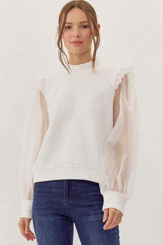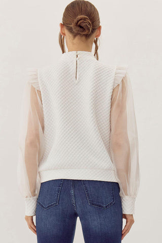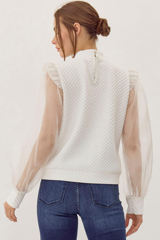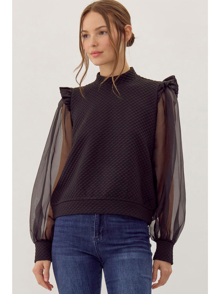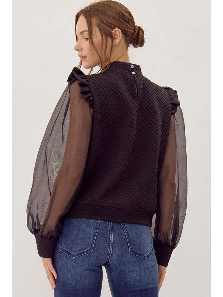 Mixed textured fabric feminine top with mock neck, back buttoned closure, frilled shoulders, long puffed sleeves, and ribbing at the sleeve ends and hemline.