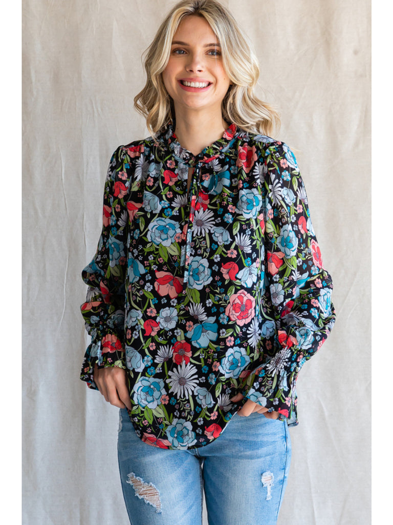 Floral print chiffon top with frilled self-tie neck, and long poet sleeves. (can be sleeves up)