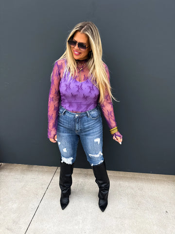Super cute for layering, this sultry stretchy lacey mesh long-sleeve top features a totally sheer design with floral embroidery.  Dainty mock neck and thumbhole details. Relaxed fit with a fluttery hemline.