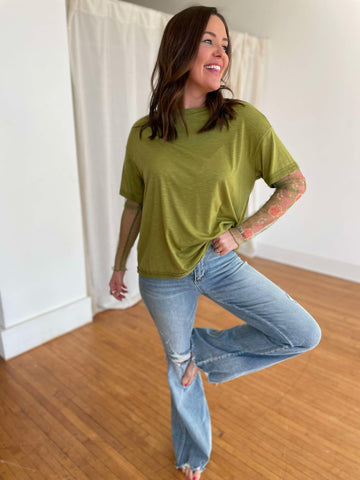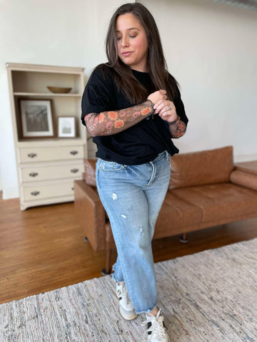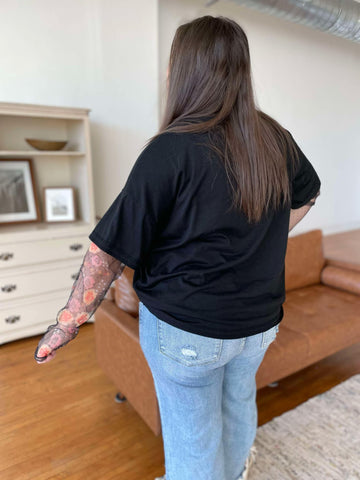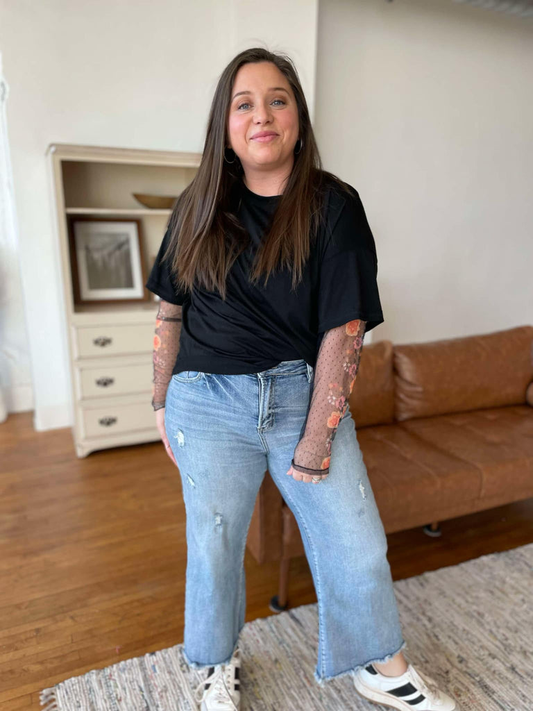 Score a two for one with these on-trend layered tees! Featuring built in sheer floral sleeves, drop shoulder and boyfriend fit. Available in two colors.