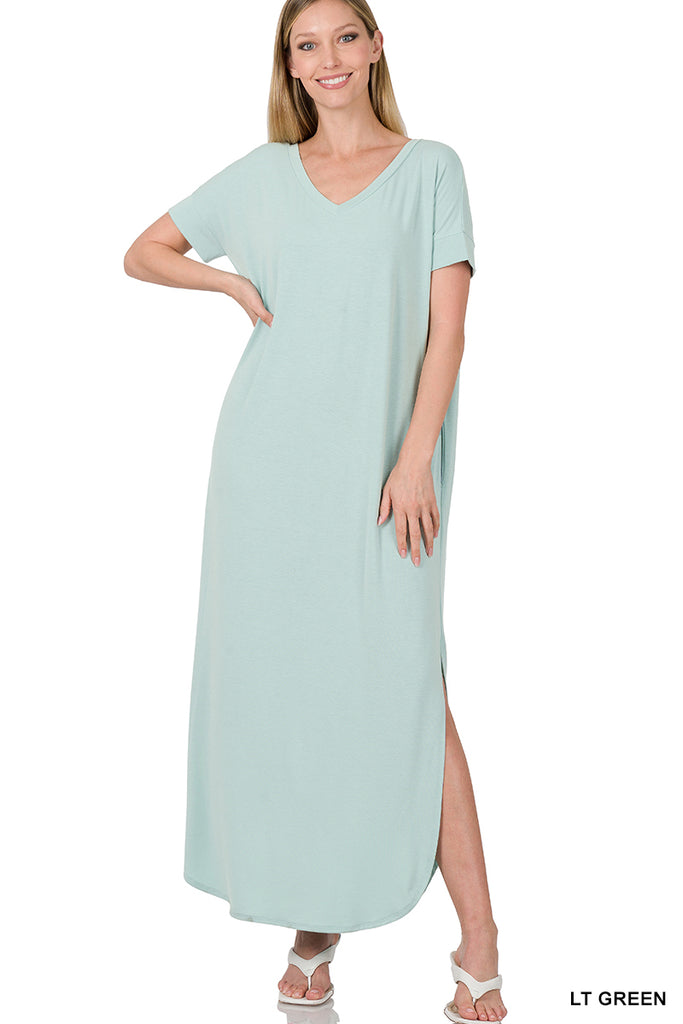 V-NECK SHORT SLEEVE MAXI DRESS- SIDE SLITS