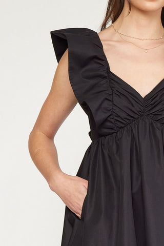 Get ready to turn heads in our BLACK BEAUTY DRESS! This stunning mini dress features oversized ruffle sleeves and ruching at the bust, creating a flattering silhouette. The smocked back and invisible zipper closure ensure a perfect fit, while the pockets add functionality. Made with a lightweight, non-sheer woven fabric and fully lined for comfort. Elevate your wardrobe with this must-have piece!