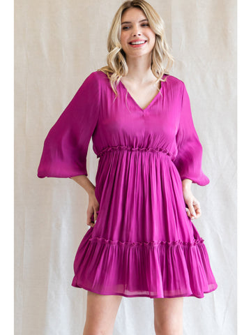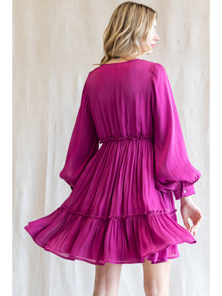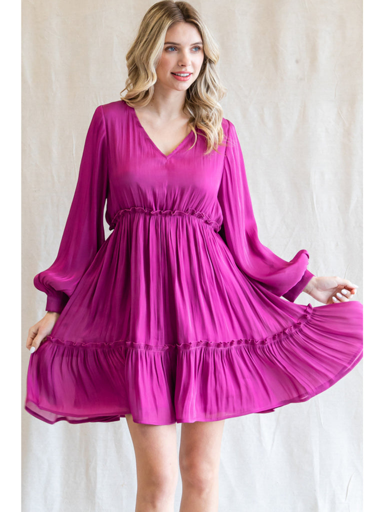 Solid chiffon baby doll dress with a V-neck, long bishop sleeves,