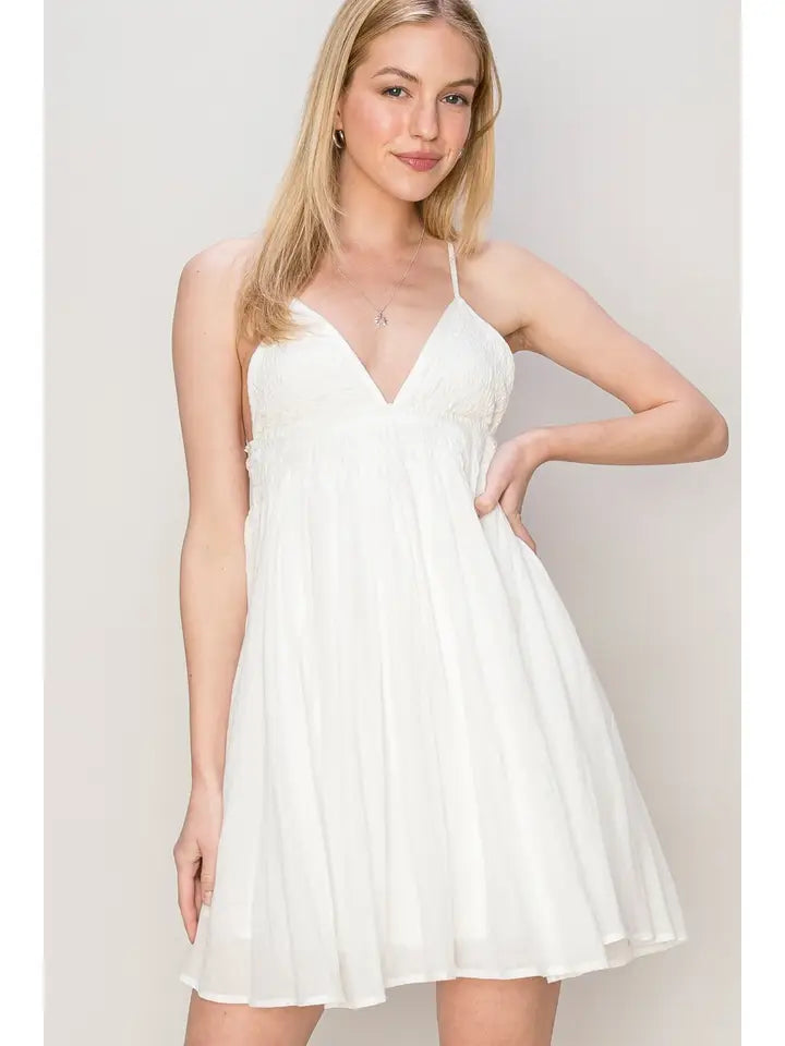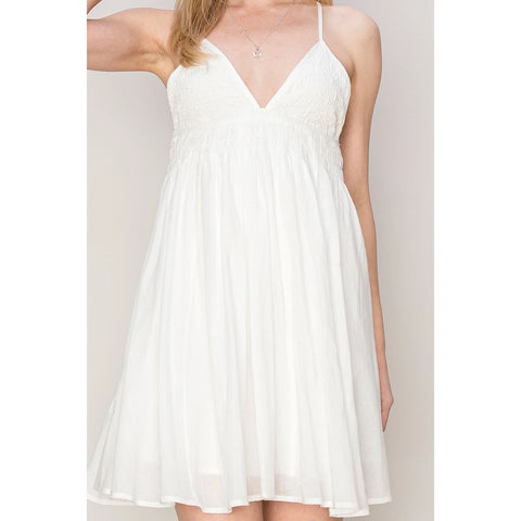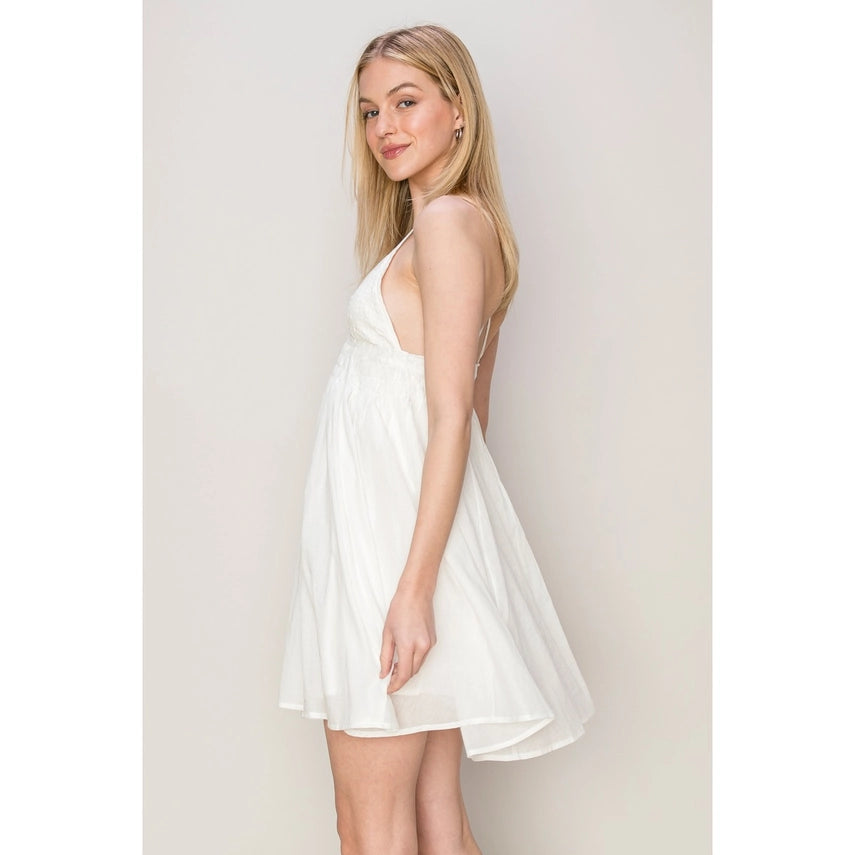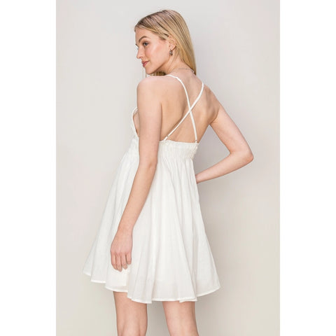 DEFINE YOUR STYLE NARRATIVE WITH THIS DRESS. CUT FROM COTTON VOILE, THIS MINI DRESS HAS A DEEP V-NECK AND CAMI STRAPS THAT CRISSCROSS OVER THE OPEN BACK. THE TRIANGLE CUPS TOP A SHIRRED WAIST FOR A FLATTERING LOOK, COMPLEMENTED BY A FLOWY SKIRT. SELF 100% COTTON, CONTRAST 70% COTTON 20% POLYESTER 10% SPANDEX MODEL IS 5' 7" TALL, 32" CHEST, 25" WAIST AND 35" HIPS AND WEARING A SIZE SMALLÂ