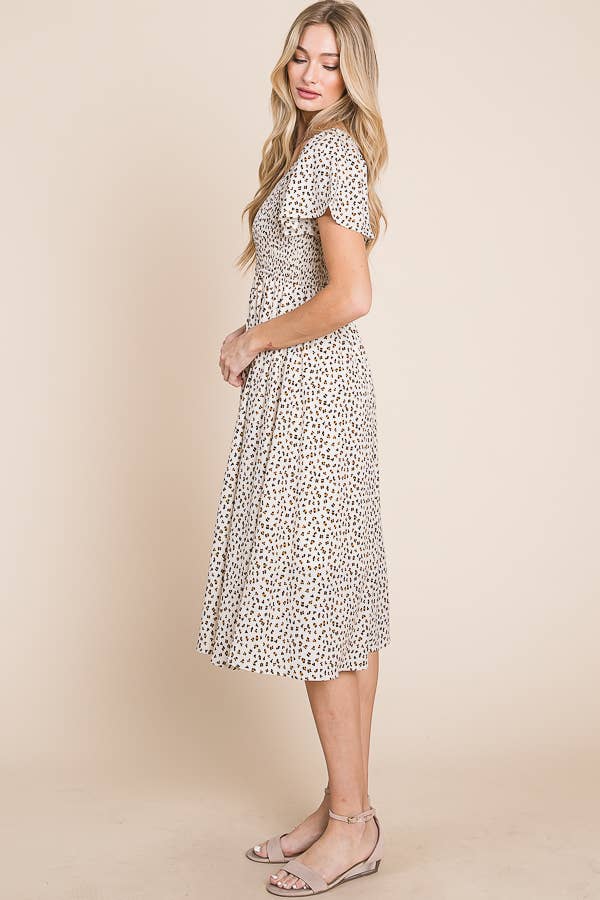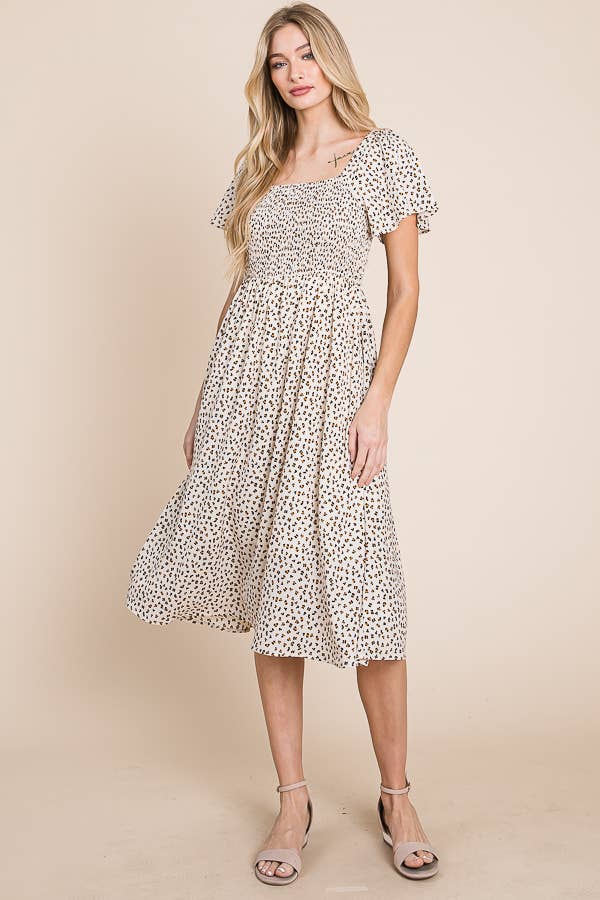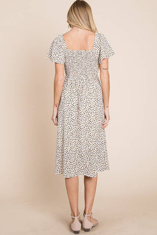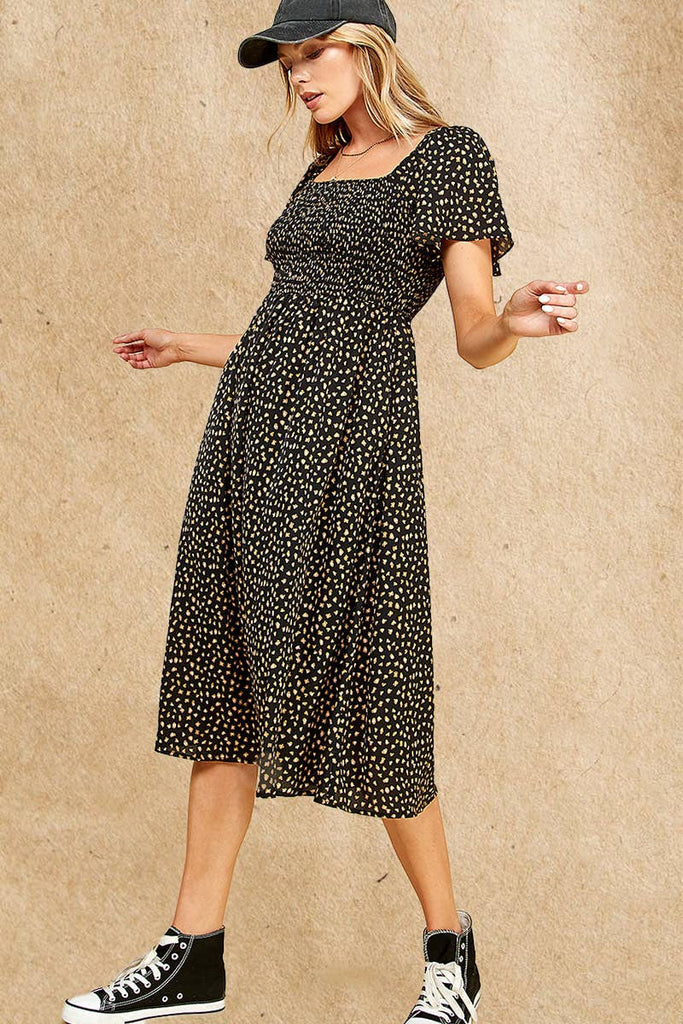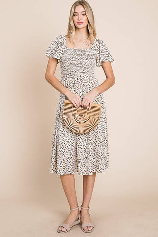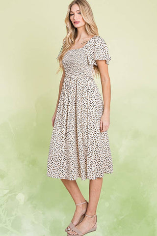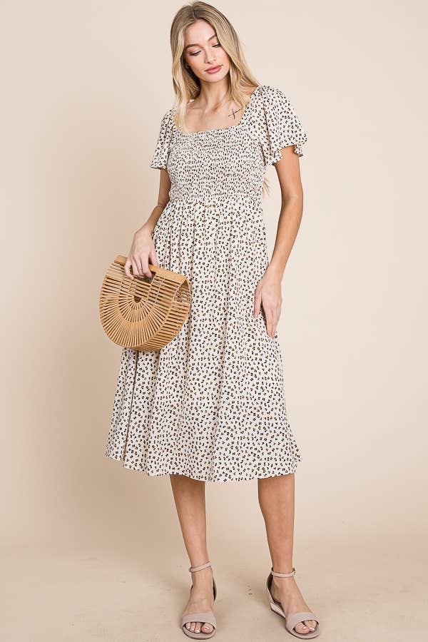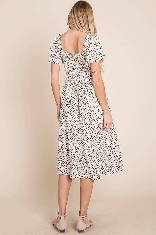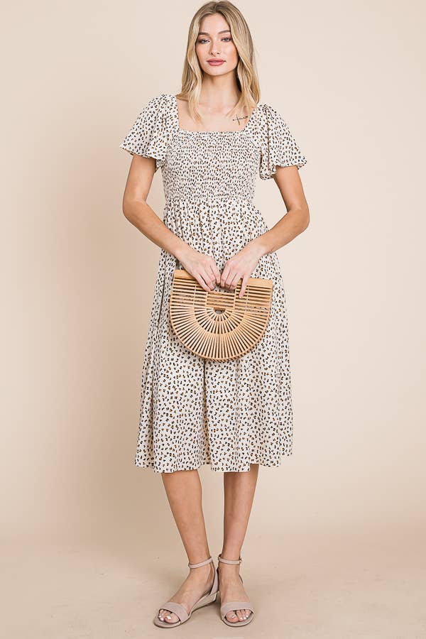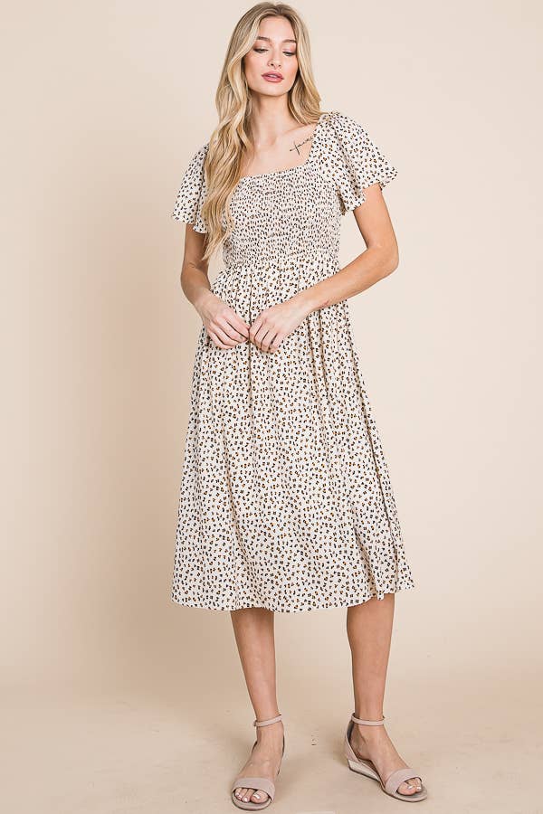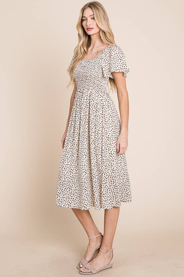 Ditsy Leopard Print Square Neck Smocked Midi Dress / MO9650