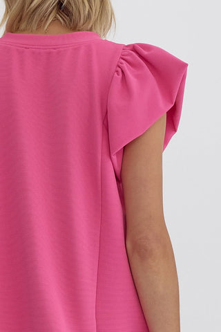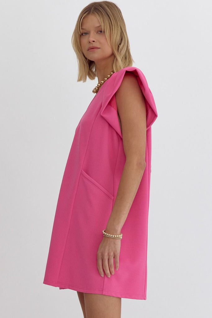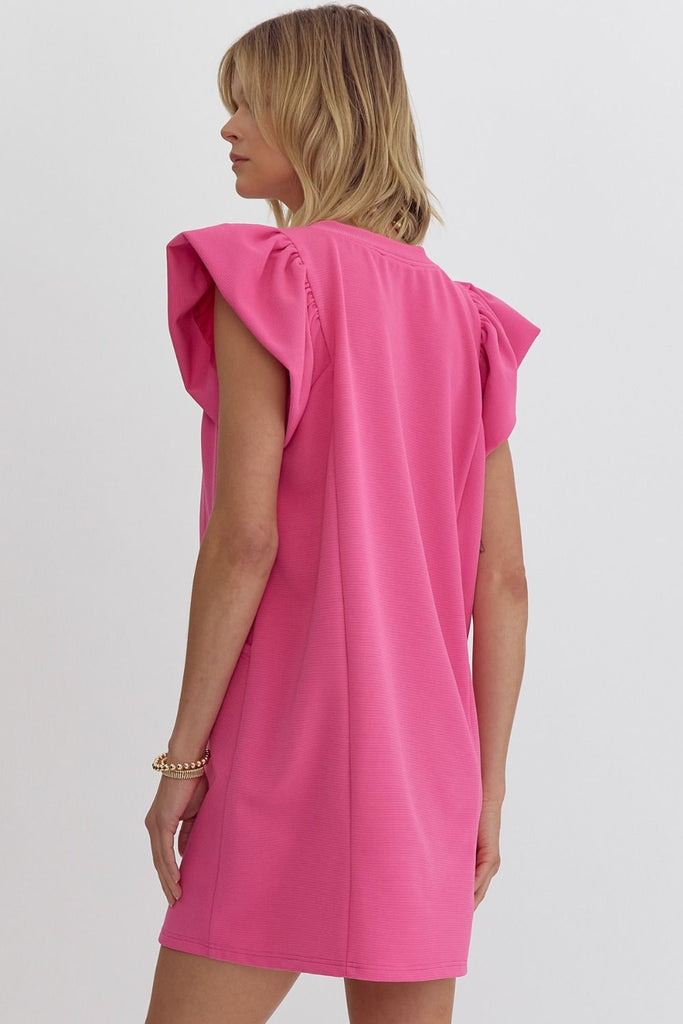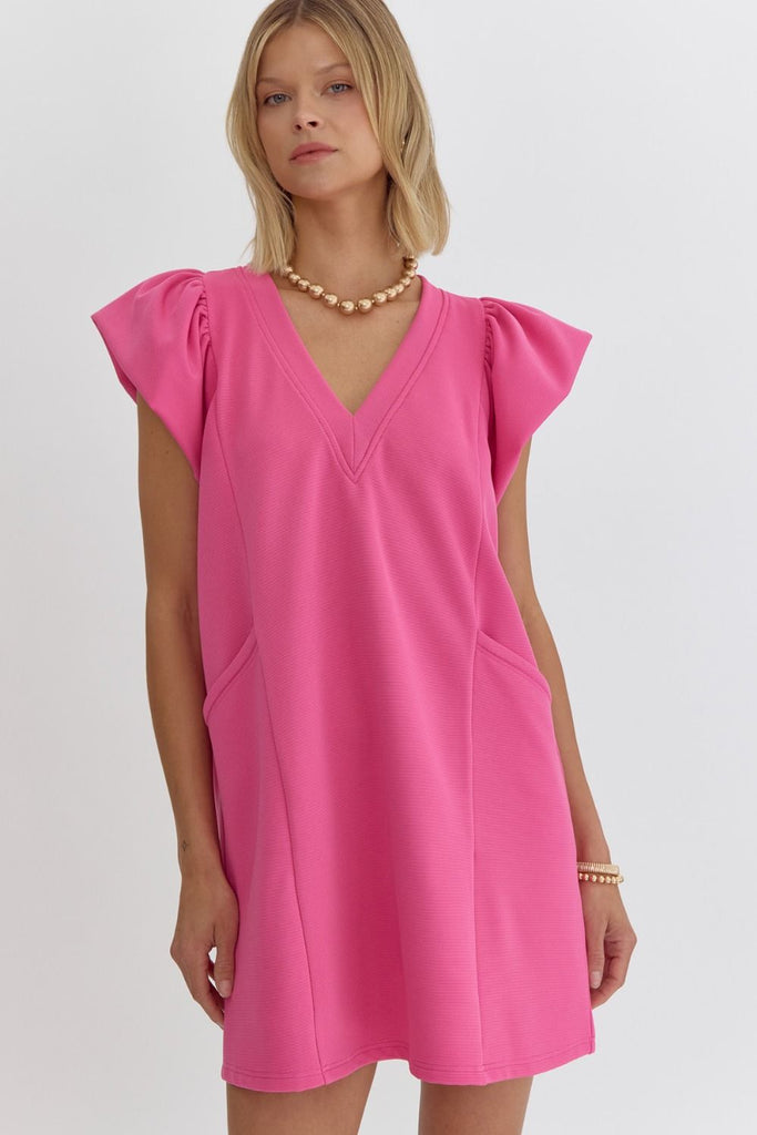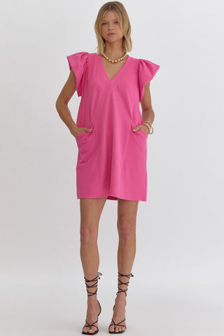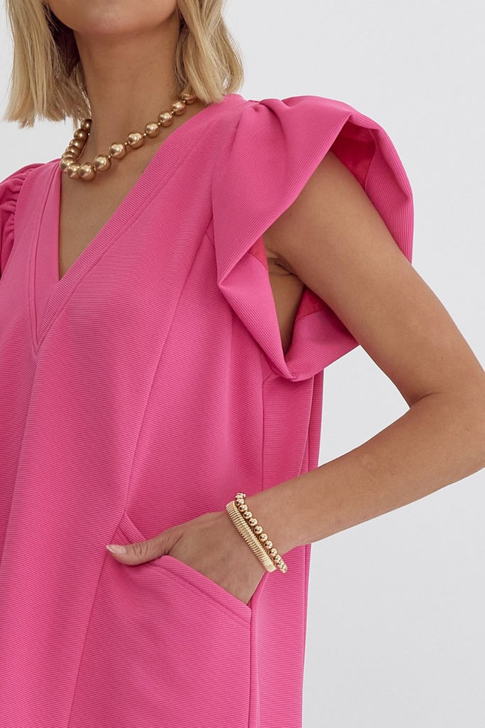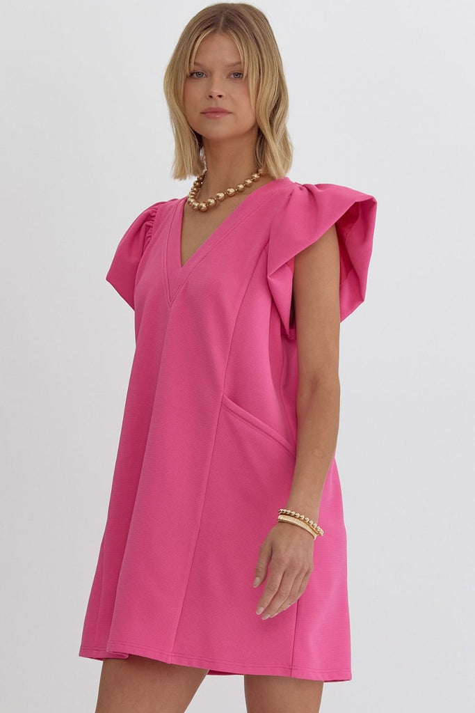 Solid v-neck ruffle sleeve mini dress featuring pockets at front. Unlined. Knit. Non-sheer. Lightweight.