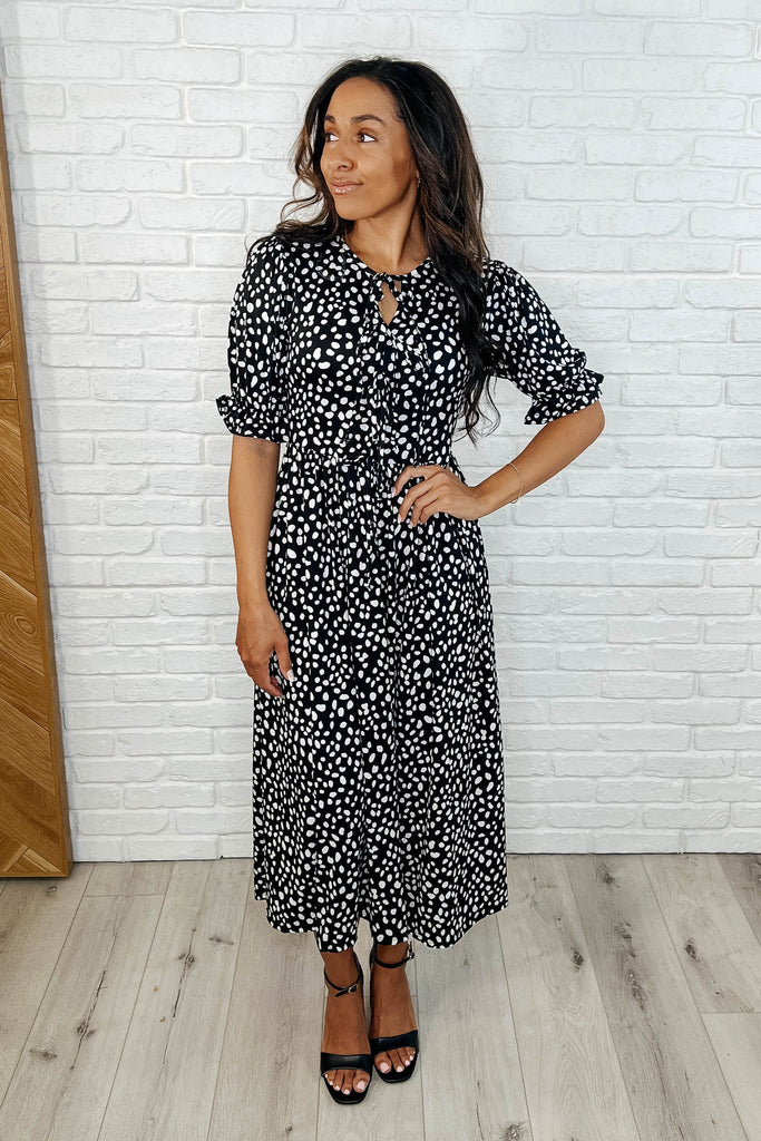 The I'm Feeling Independent Half Sleeve Dress is all about effortless style and comfort. Made from buttery soft knit, this dress features a flattering V-neckline with a functional neck tie that adds a chic touch. The gathered sleeves and elastic sleeve cuffs create a feminine, relaxed silhouette, while the elastic waistline ensures a perfect fit. Functional side pockets bring practicality, and the ruffle and bow details add a playful, romantic finish. This dress is perfect for making a statement while feeling comfortable and free.