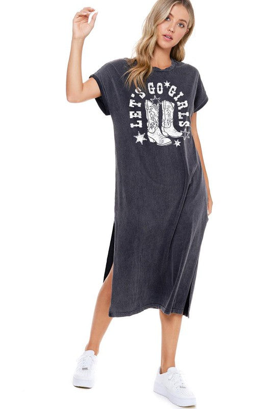 Let your style run wild with the Let's Go Girls Maxi Dress! Crafted with a mineral washed cotton, this maxi T-shirt dress has tacked sleeves and side slits, letting you enjoy your day in comfort and style. And with its fun LET'S GO GIRL graphic, you'll make a statement wherever you go!