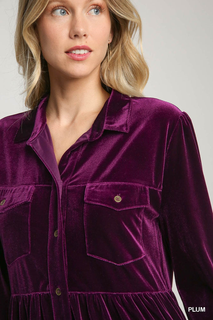 VELVET LONG SLEEVE COLLAR BUTTON DOWN TIERED DRESS