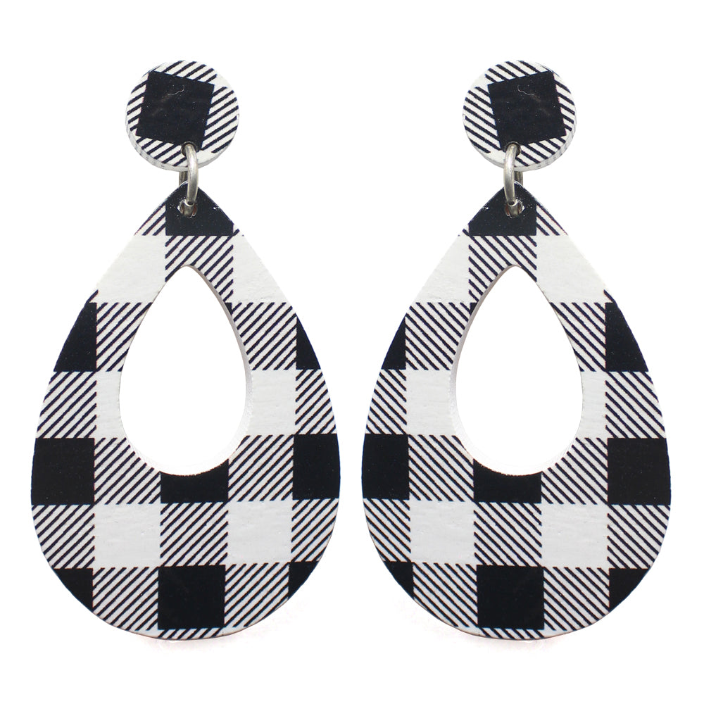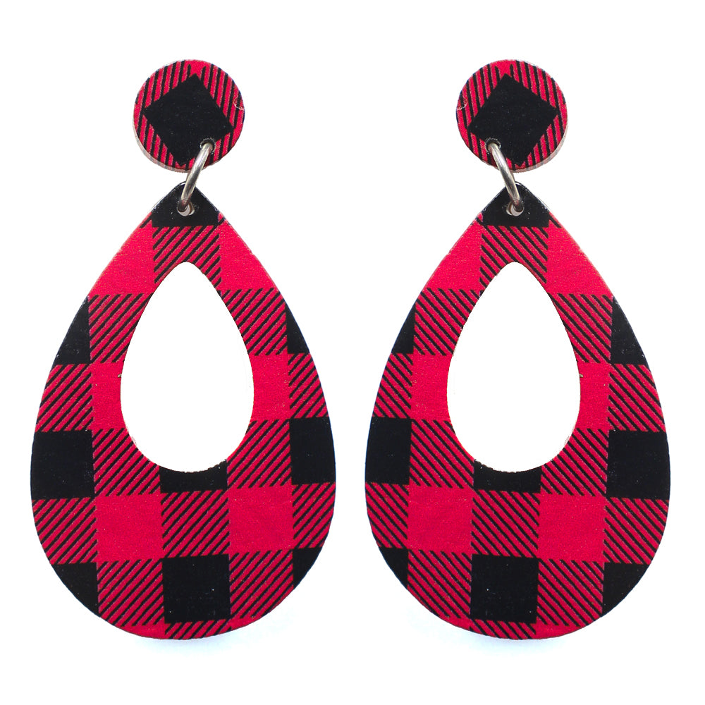 Buffalo Plaid, Cut-out Teardrop WOOD, Post Drop Earring.