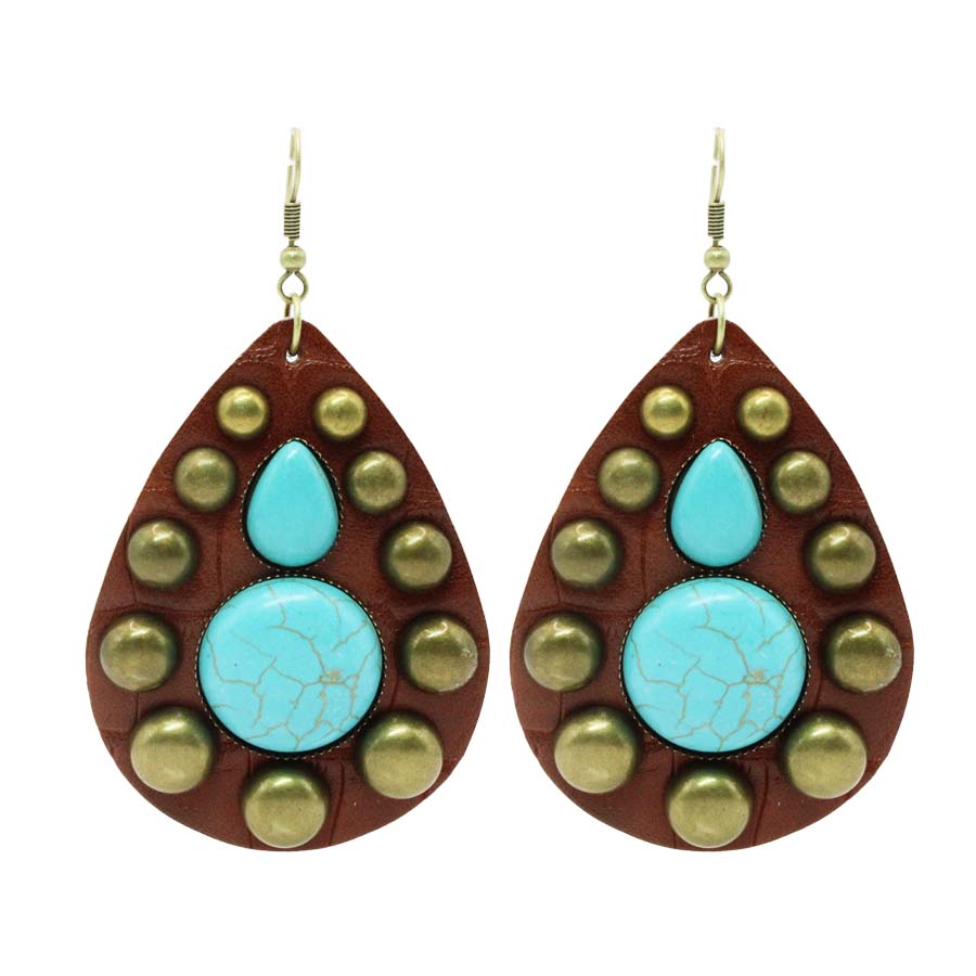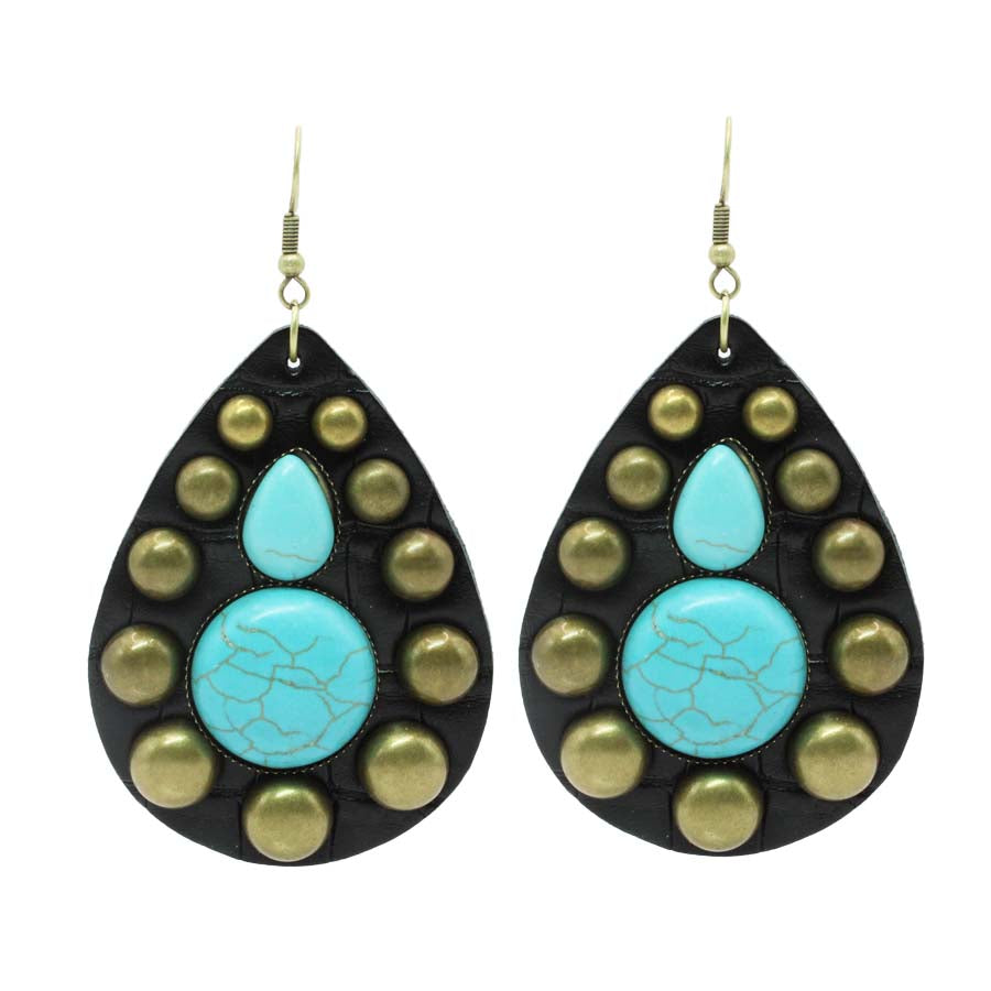 Make a fashion statement with these Western Leather Earrings! Featuring beautiful tear drop PU leather and a stunning turquoise stone, these earrings will be sure to make any outfit pop. Measuring 3”L, they are lead and nickel compliant for added comfort and safety.
