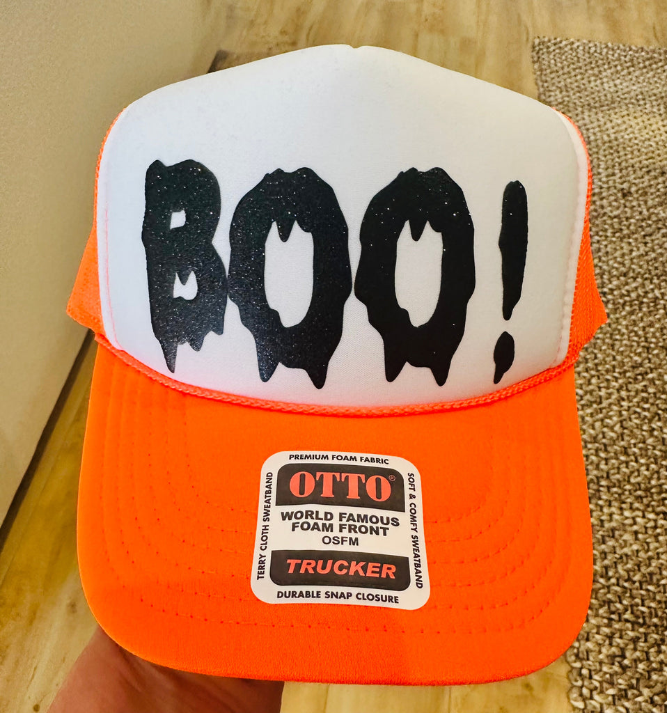 "Jack O Lantern Face" design3D Puff Neon Orange Vinyl on a Black foam trucker hat. The perfect accessory to make a bold statement!