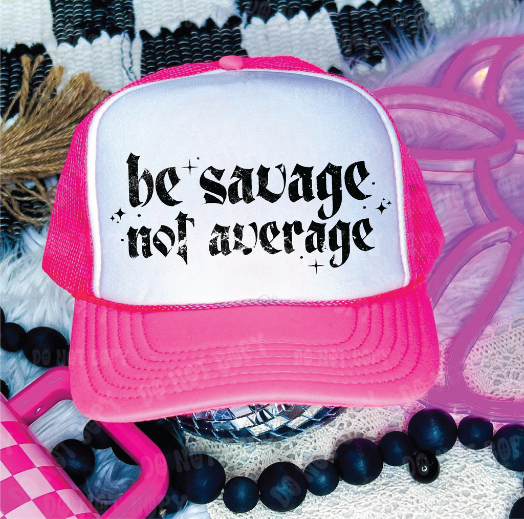 "Be Savage Not Average" design direct-to-film printed on a Neon PInk & White foam trucker hat. The perfect accessory to make a bold statement!