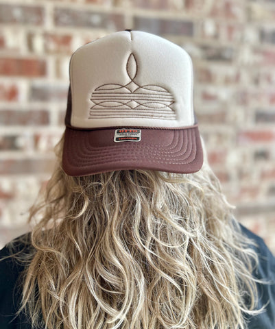 -Brown threaded boot stitch embroidered on a Brown & Tan foam trucker hat