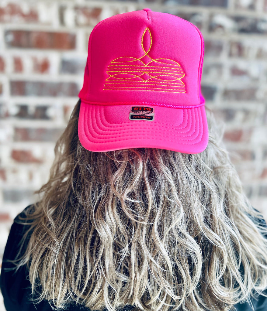 -Neon Yellow threaded boot stitch embroidered on a Neon Pink foam trucker hat