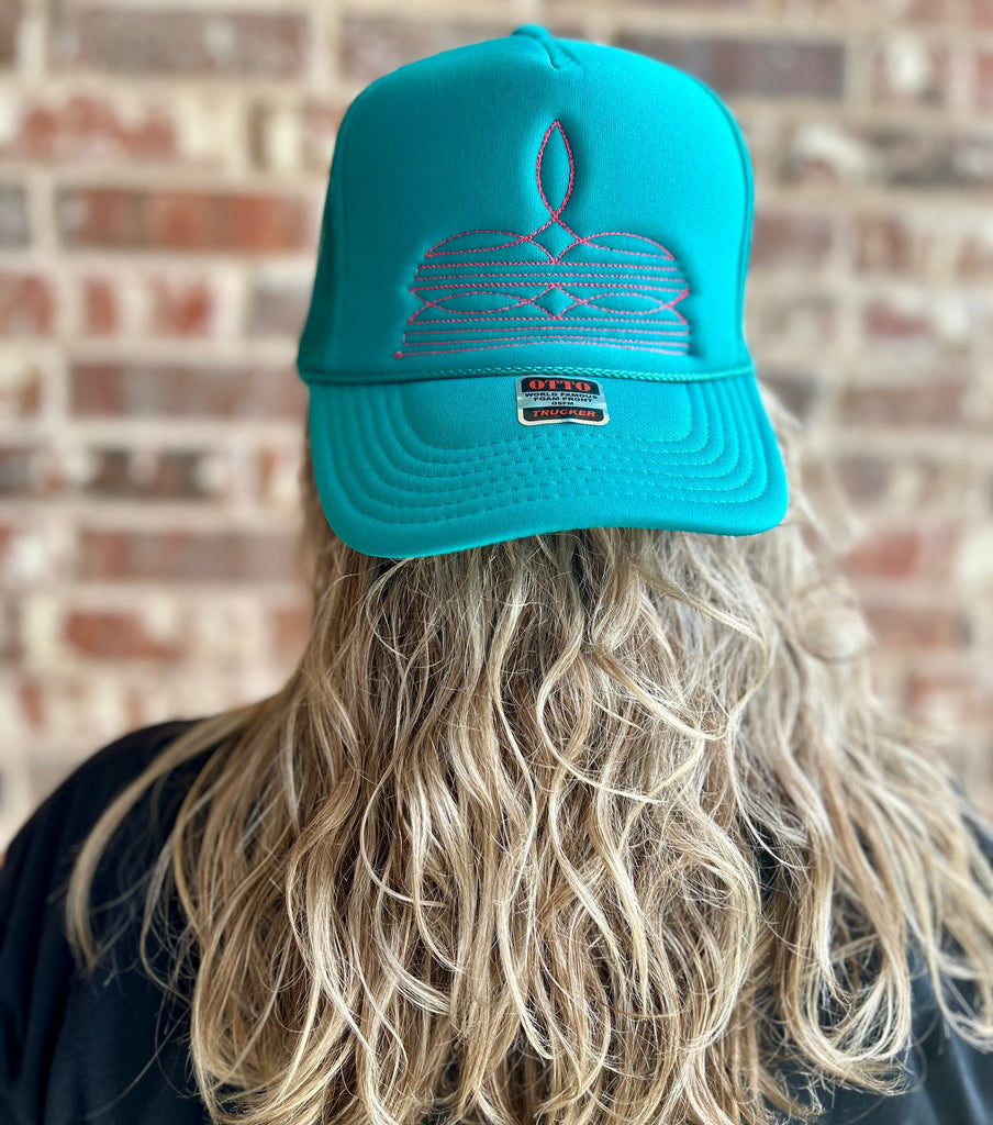-Pink threaded boot stitch embroidered on a Teal foam trucker hat