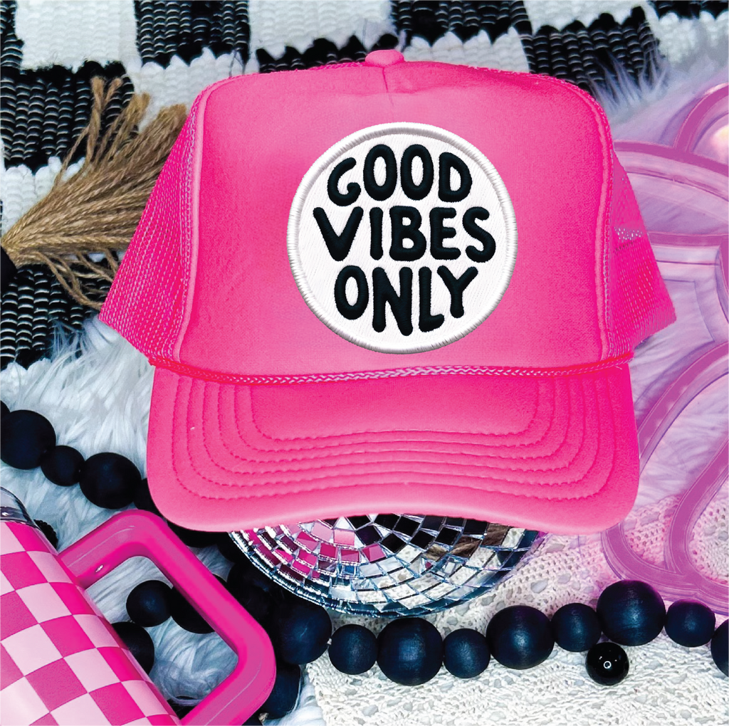 "Good Vibes Only" design direct-to-film printed on a Neon Pink foam trucker hat. The perfect accessory to make a bold statement!