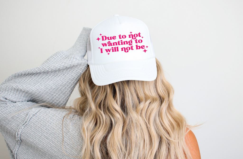 "Due To Not Wanting To" design direct-to-film printed on a White foam trucker hat. The perfect accessory to make a bold statement!