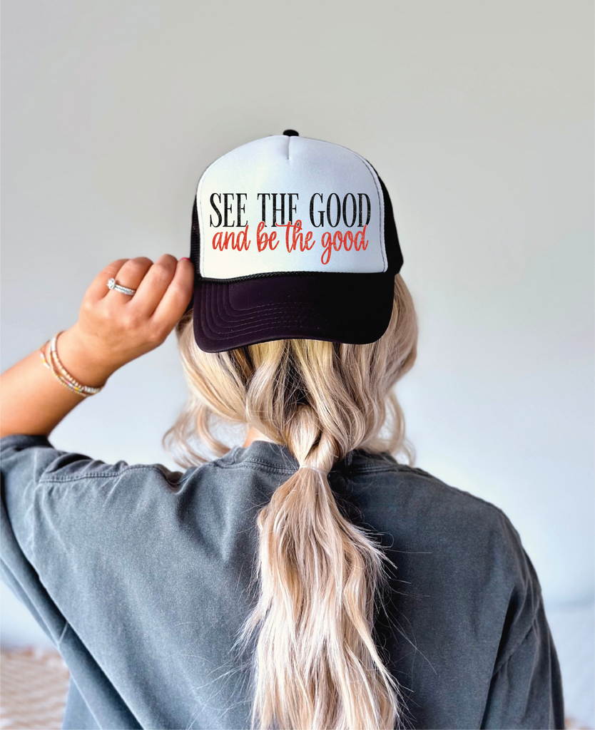 See The Good Be The Good DTF Printed Black and White Trucker Hat