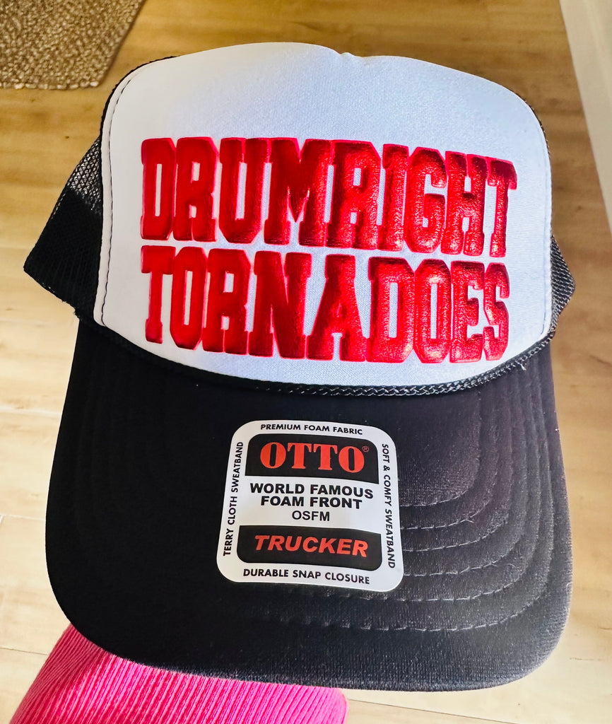 "Drumright Tornadoes" Red Metallic Puff Vinyl on a Black & White foam trucker hat. The perfect accessory to make a bold statement!