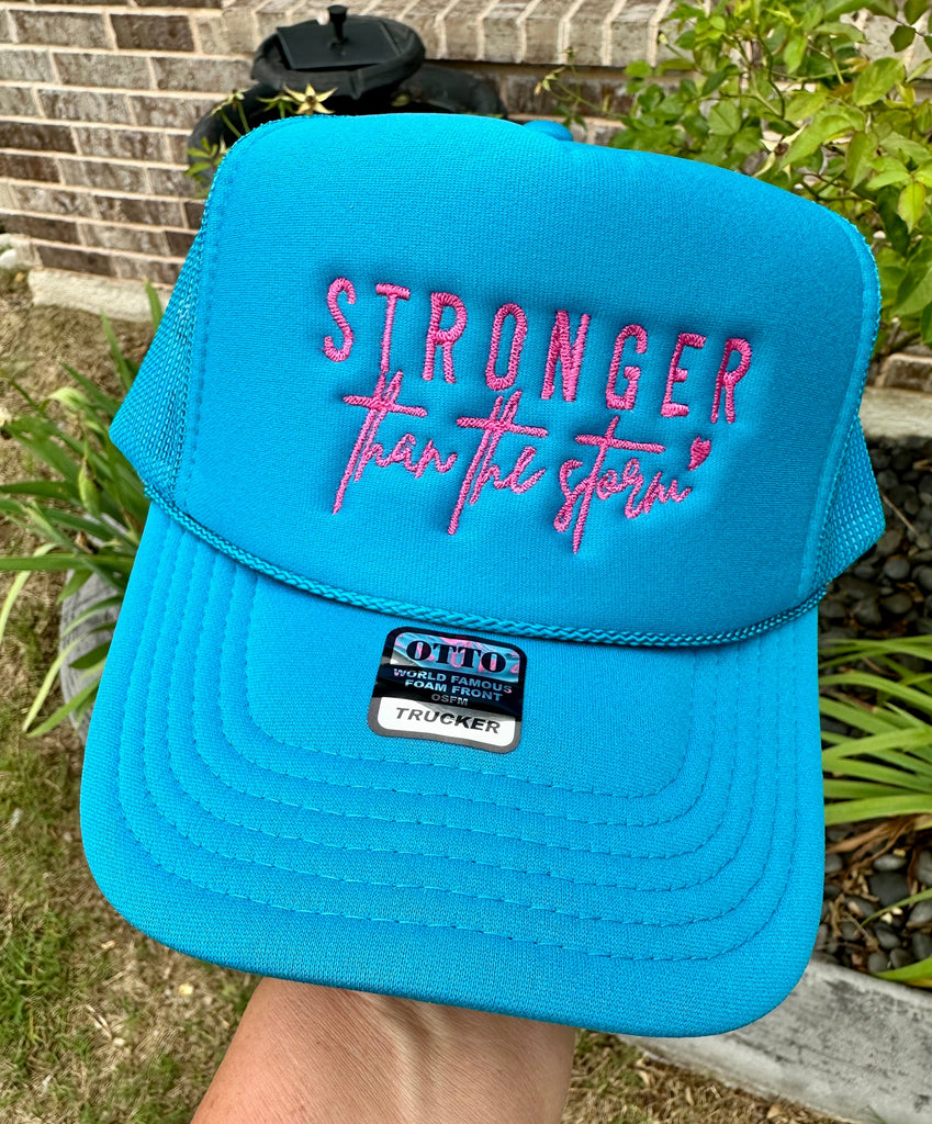 Hot Pink threaded "Stronger Than The Storm" design embroidered on a Jade foam trucker hat