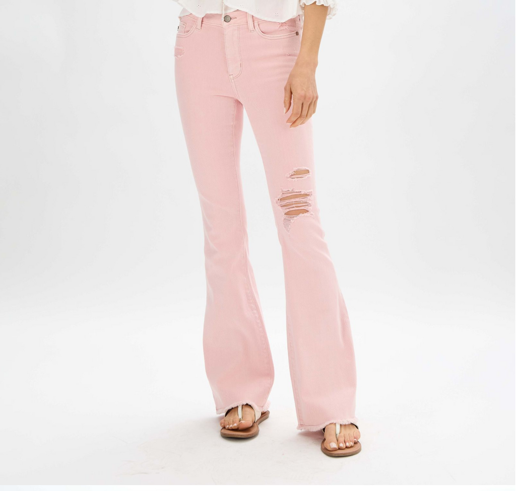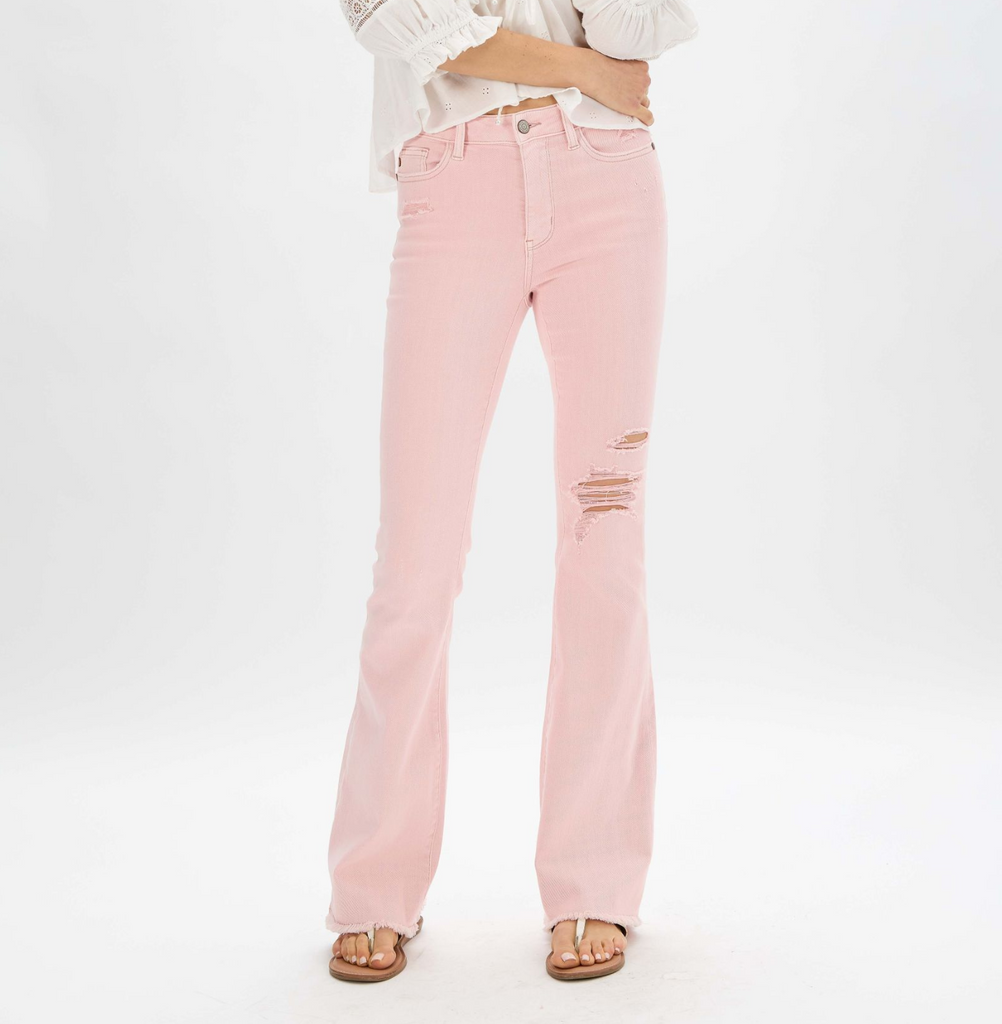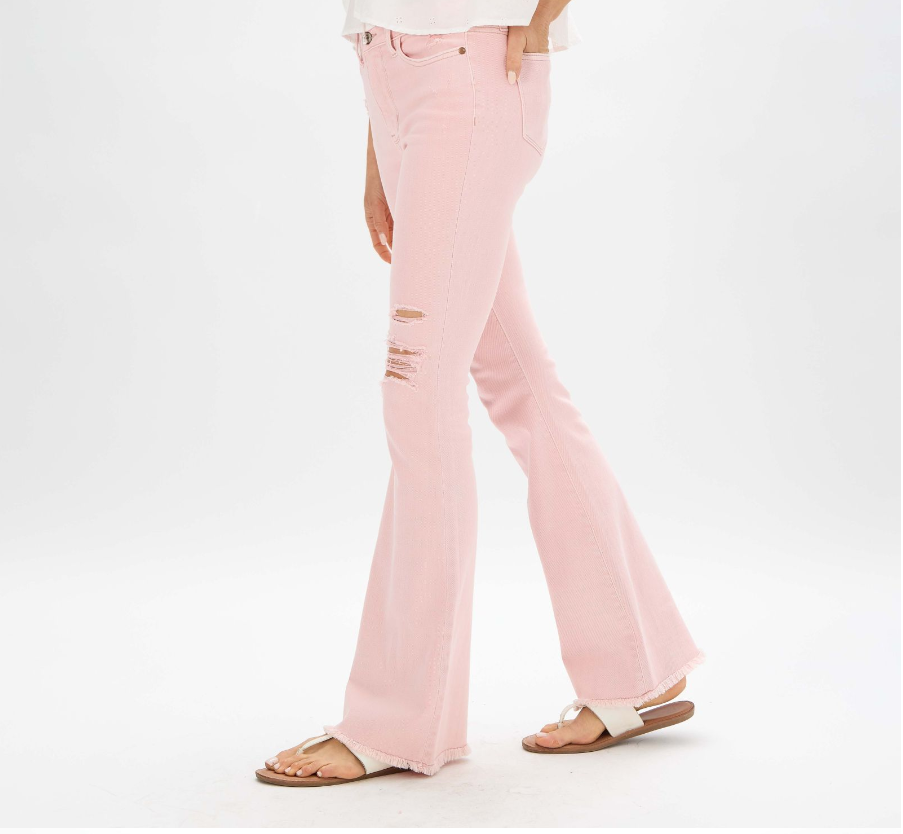 - MIDRISE GARMENT DYED PASTEL PINK DESTROYED FLARE