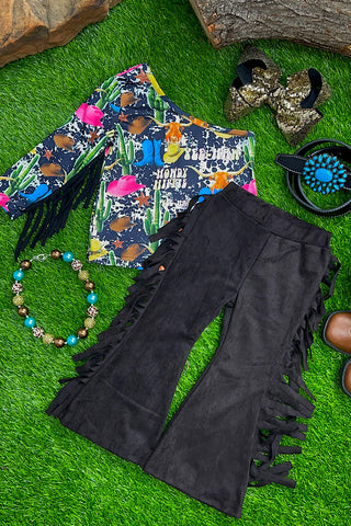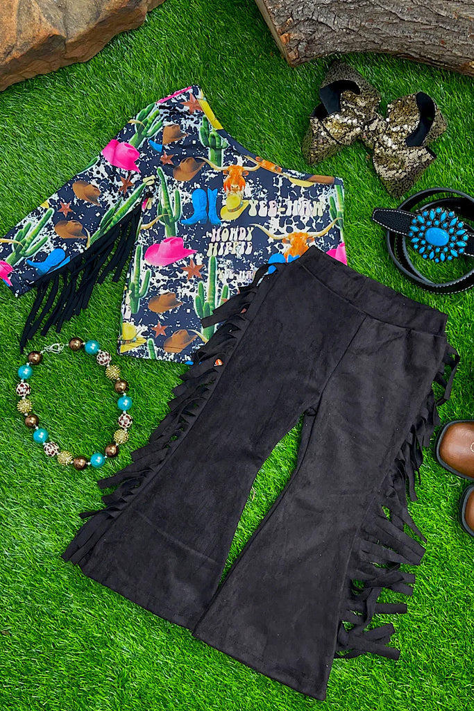 BLACK SUEDE FABRIC FRINGE BOOT CUT PANTS