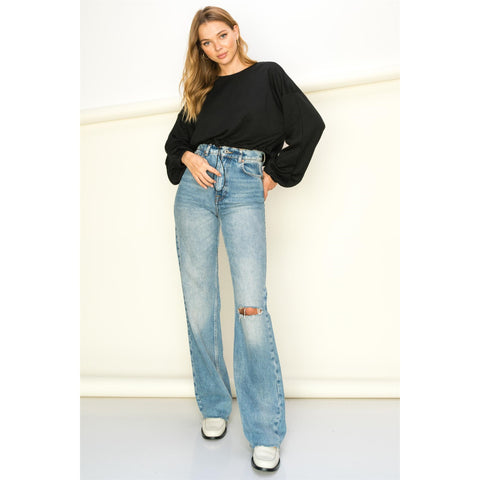MADE WITH A CLASSIC CREW NECKLINE, DROP SHOULDERS AND LONG SLEEVES WITH ELASTICATED CUFFS, THIS TOP HAS SLOUCHY SILHOUETTE BOASTS AN OVERSIZED LOOSE FIT. SLIGHTLY CROPPED HEM IS FINISHED OFF WITH A CINCHING TIE SELF: