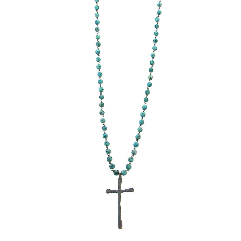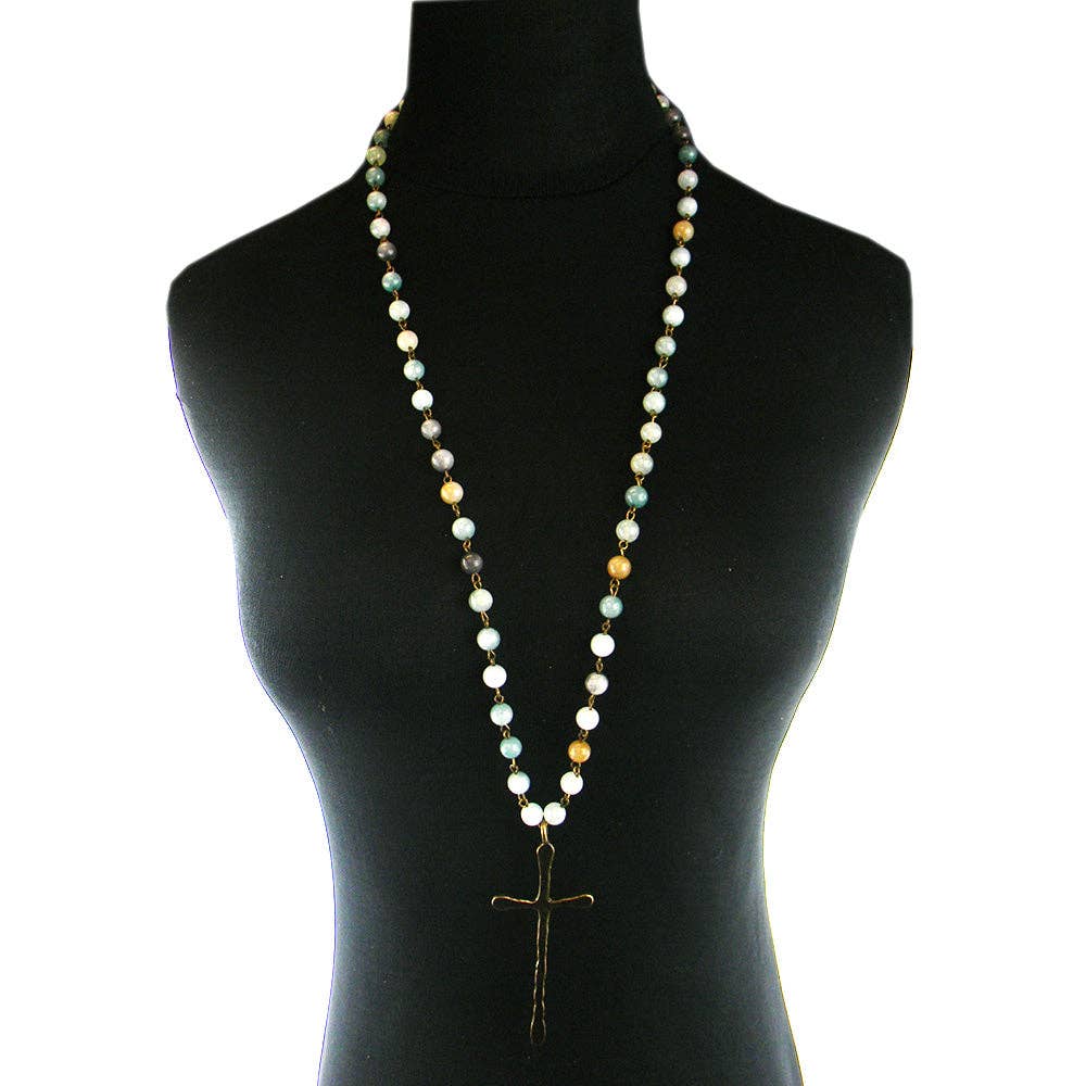 34" 8mm Real Stone Ball Linked Necklace w/Cross Pendent