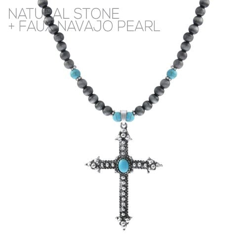 Navajo Pearl Bead Necklace w/ Turquoise Embedded Metal Beaded Cross