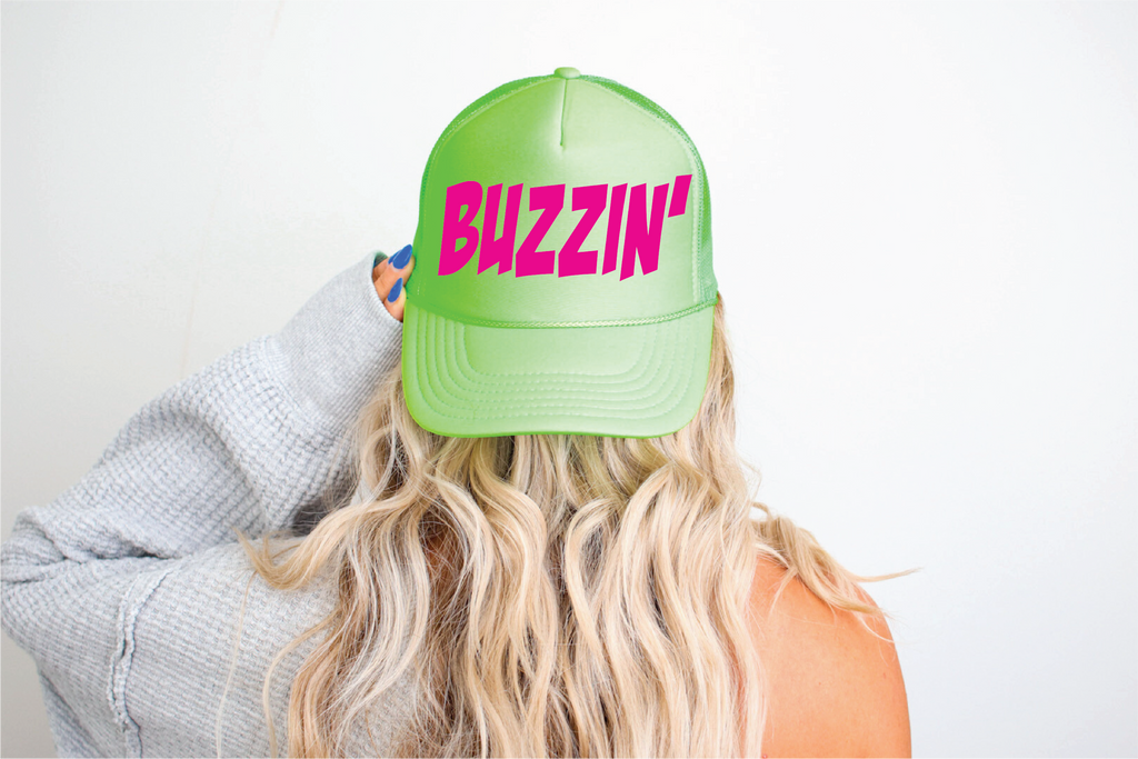 "Buzzin" design direct-to-film printed on a Neon Green foam trucker hat. The perfect accessory to make a bold statement!
