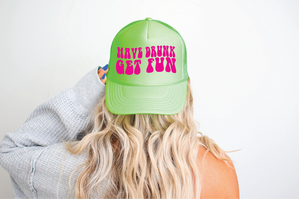 "Have Drunk Get Fun" design direct-to-film printed on a Neon Green foam trucker hat. The perfect accessory to make a bold statement!