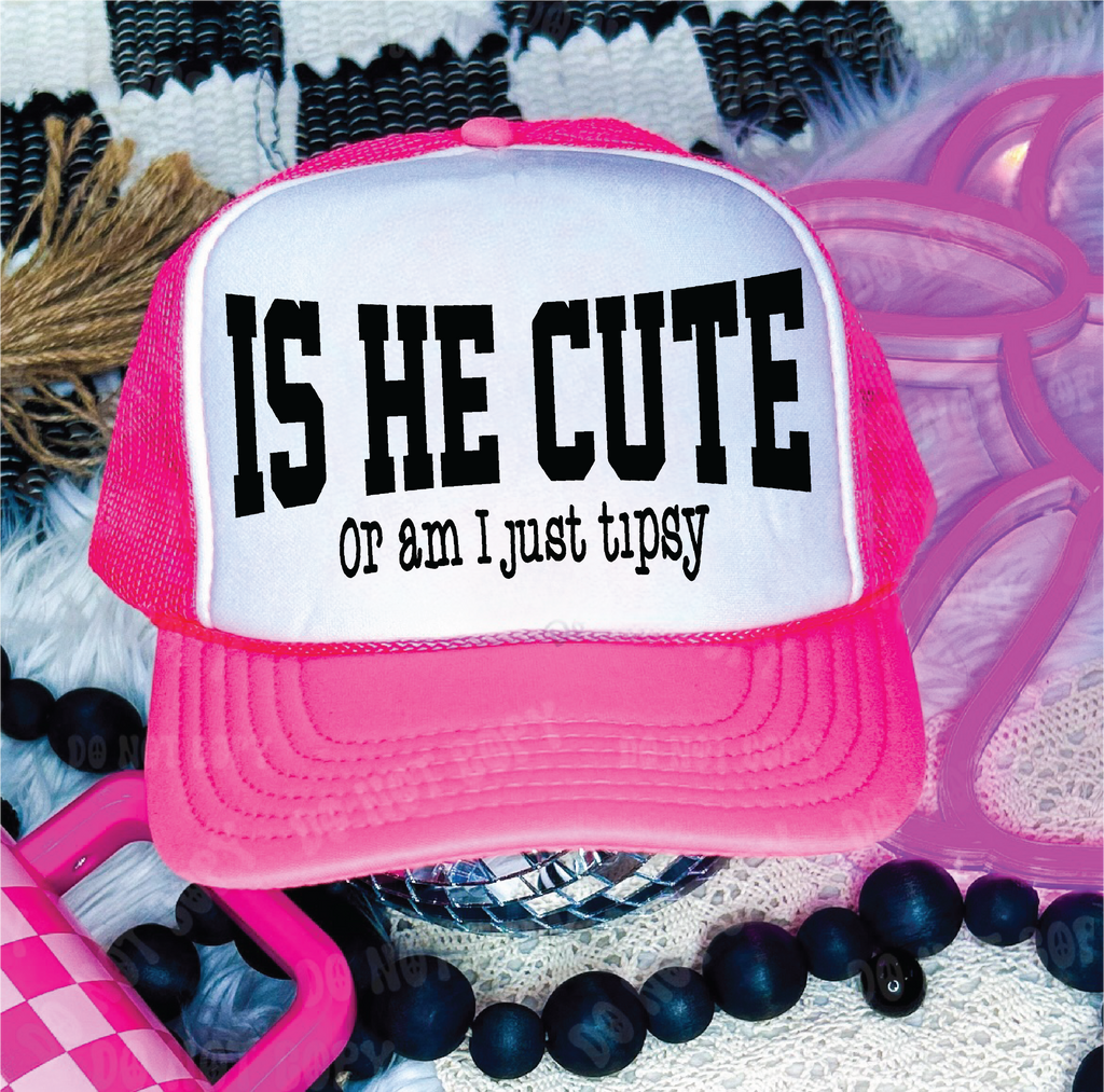 "Is He Cute" design direct-to-film printed on a Neon Pink & White foam trucker hat. The perfect accessory to make a bold statement!