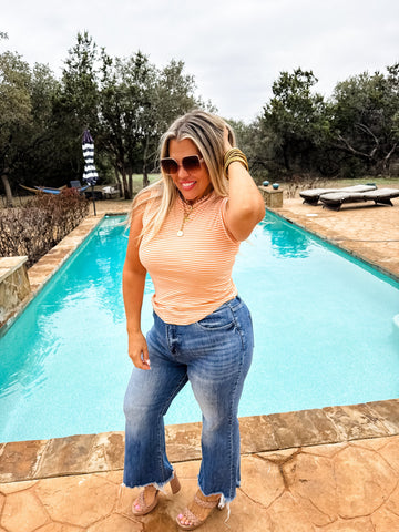 The cutest Tank! Features a raw hem stitching look on the outside, raw curved waist hemline that is so flattering, and a patch detail on the back. Fabric is a high quality striped rib that has a perfect medium thickness. The BEST basic tank! You will LOVE these!