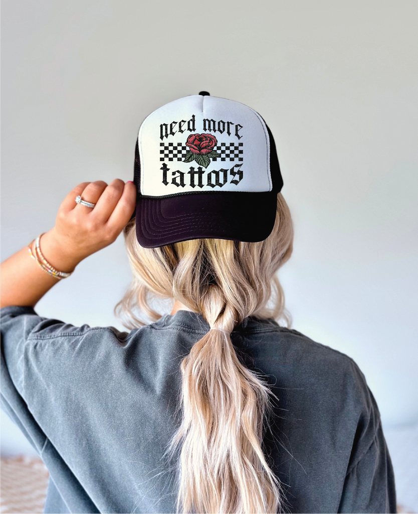I Need More Tattoos DTF Printed Black and White Trucker Hat