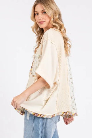 The Half Button Floral Patchwork Top is a stylish and unique piece that combines different patterns for a trendy look. The half button detailing adds a casual and laid-back vibe to the top. The floral patchwork design gives a bohemian and eclectic feel to the garment. This top is perfect for adding a pop of color and personality to your outfit. Pair it with jeans or shorts for a fun and playful ensemble that is perfect for a casual day out or a weekend brunch.