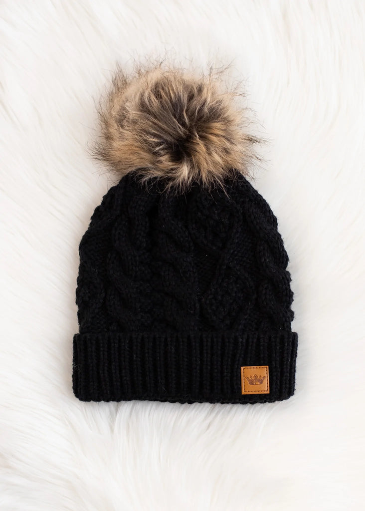 Black cable knit hatNatural faux fur pom accentFleece lined100% AcrylicPairs with matching mittens M-57