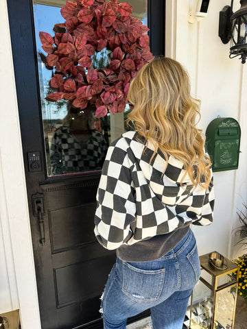 Our cute new printed checker washed hoodie offers a perfect blend of comfort and practicality. Has a slight faded color look from the washing.  Crafted from high-quality fabric, this pullover has a relaxed fit and comes with a front pocket, zip up neckline and hoodie. Semi crop length! Not too short or too long! Perfect! Of course!!! - thumbholes are present!