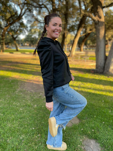 Elevate your hoodie game with this feminine spin on a closet staple featuring a ruched puff sleeve and functional hood. Available in three colors!