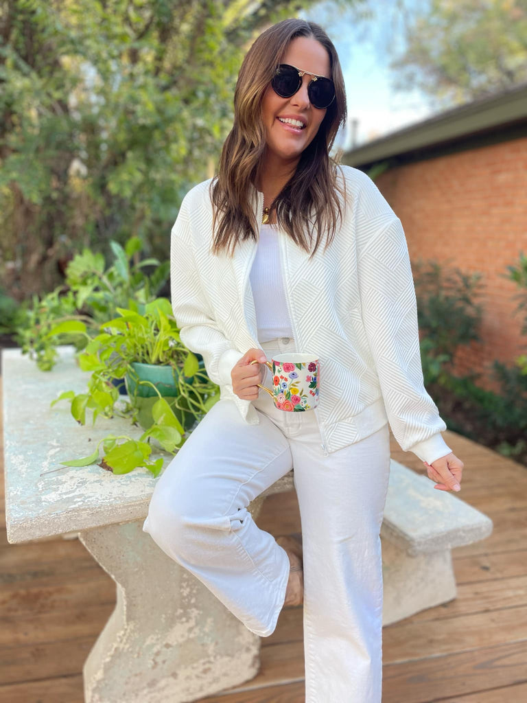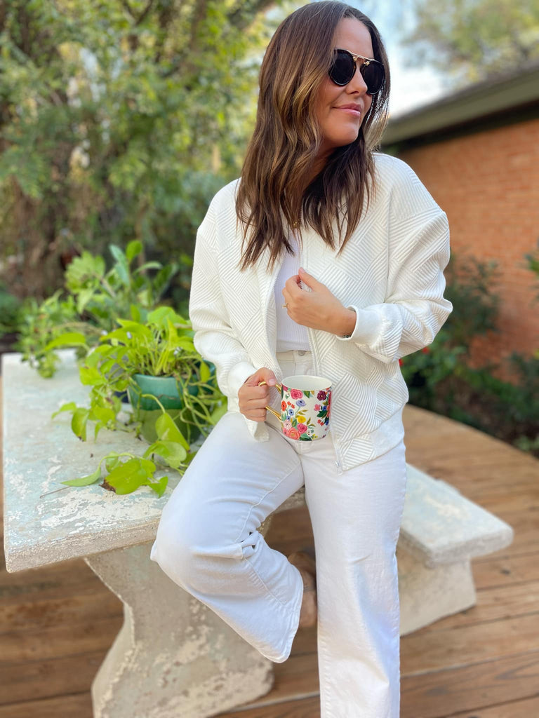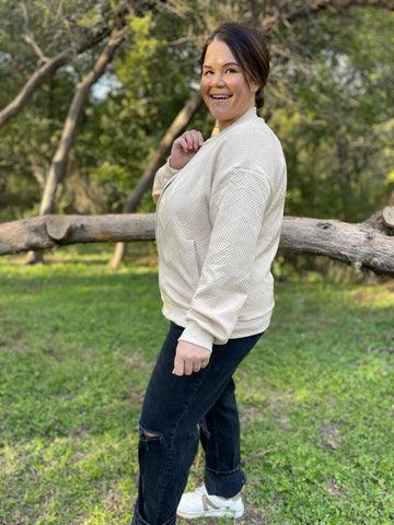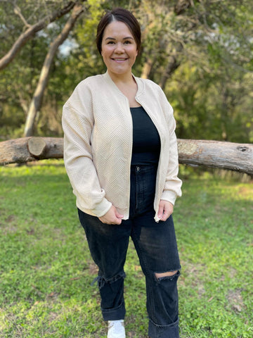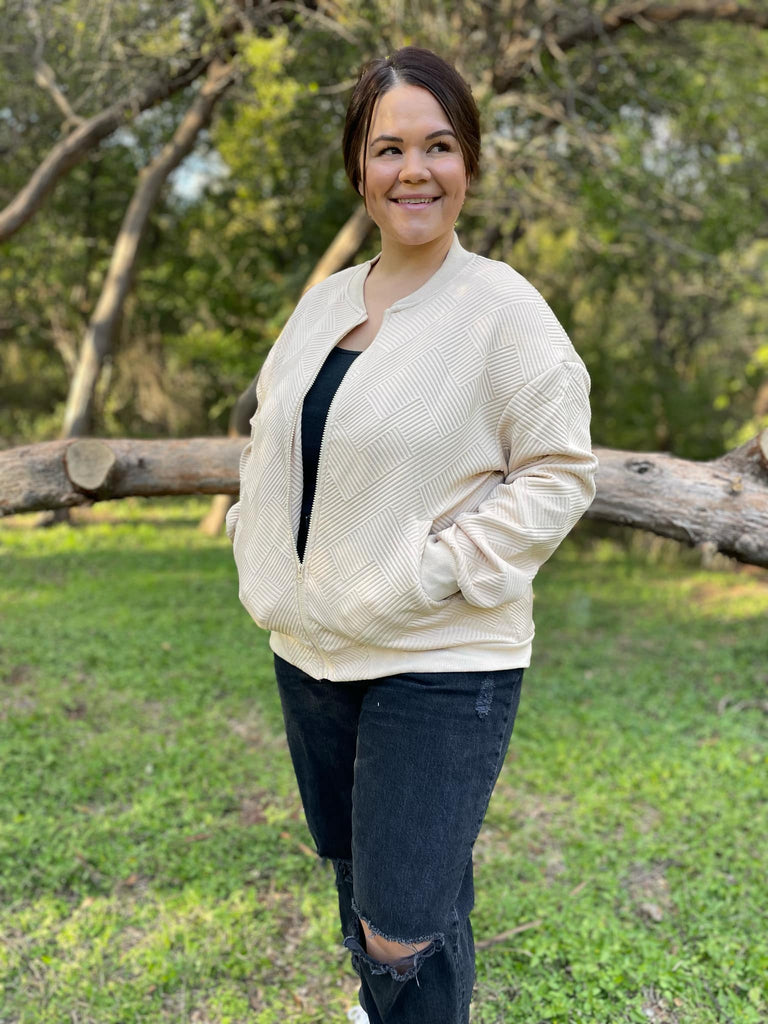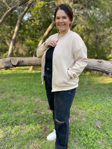 One of our favorites is back in 3 new spring colors! This classic and cool textured bomber style jacket is a new closet staple. Featuring a sleek stand neck collar, functional zipper and pockets. Available in five colors!