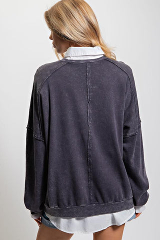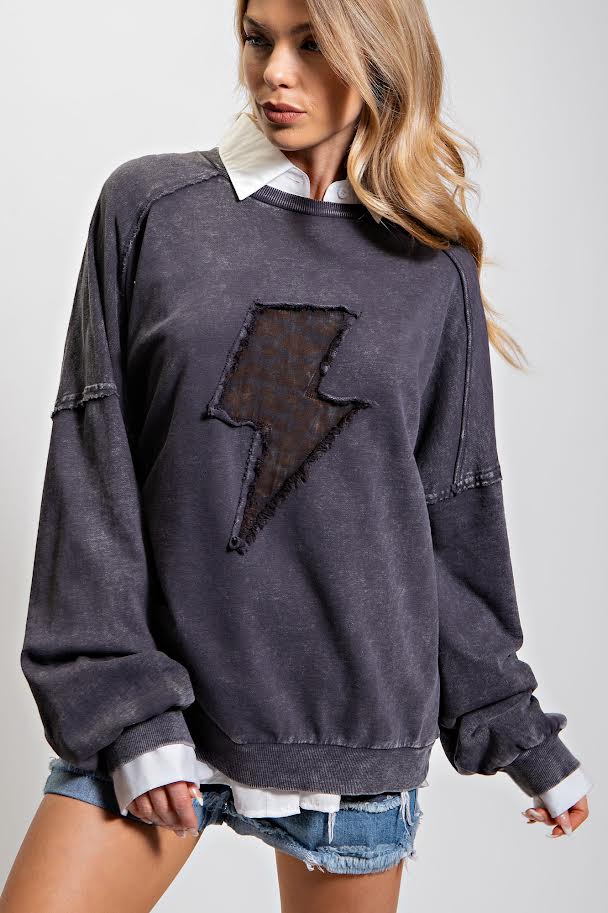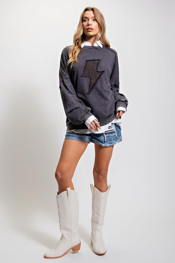 Description: AN ABSOLUTE ESSENTIAL MINERAL WASHED TERRY KNIT PULLOVER-UNIQUE LIGHTNING PATCH FRONT-LEOPARD / CHEETAH / ANIMAL PRINT-CREWNECK SILHOUETTE-TIMELESS VINTAGE INSPIRED-OVERSIZED PULL ON STYLE-RIBBED CUFF AND HEM