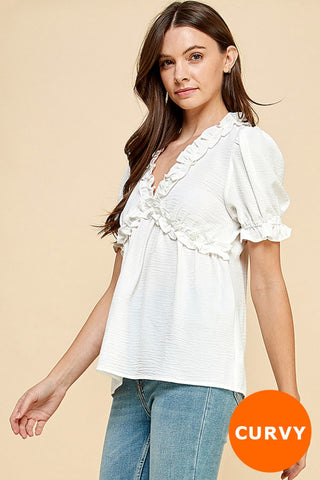 CURVY SOLID RUFFLE V NECK BABY DOLL SS TOP