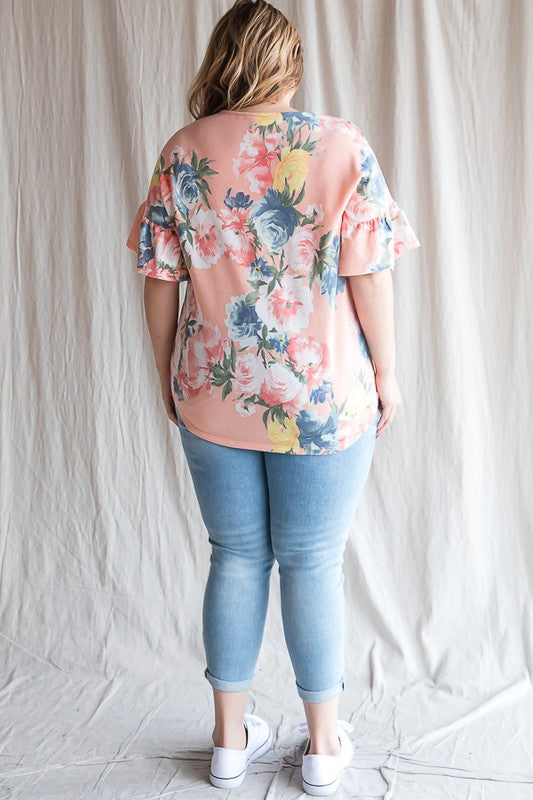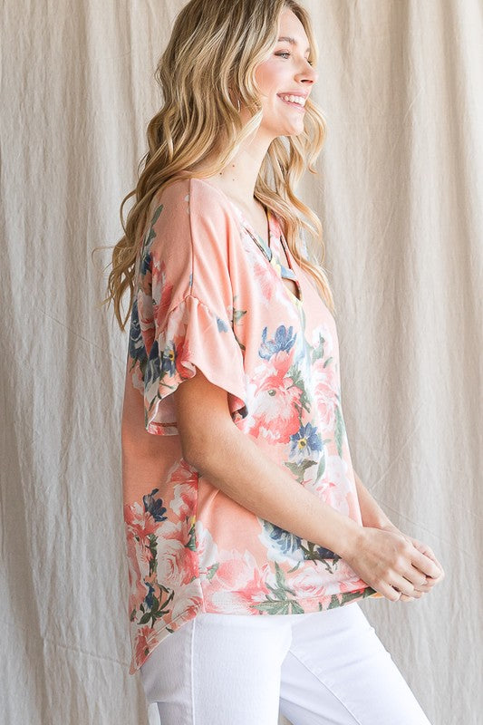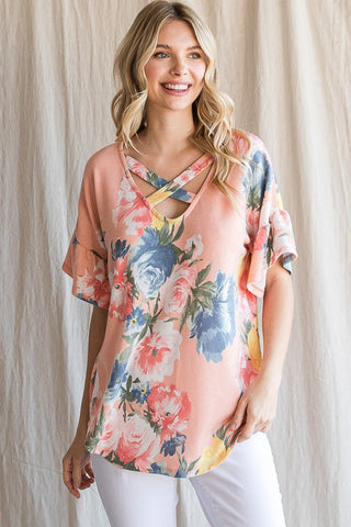 A FLORAL PRINT TOP FEATURING A RUFFLED SLEEVE, CRISSCROSS , V NECK, CURVED HEM, RELAXED FIT, AND SHORT SLEEVE. *MODEL IS WEARING SIZE SMALL62% POLYESTER 33% RAYON 5% SPANDEX