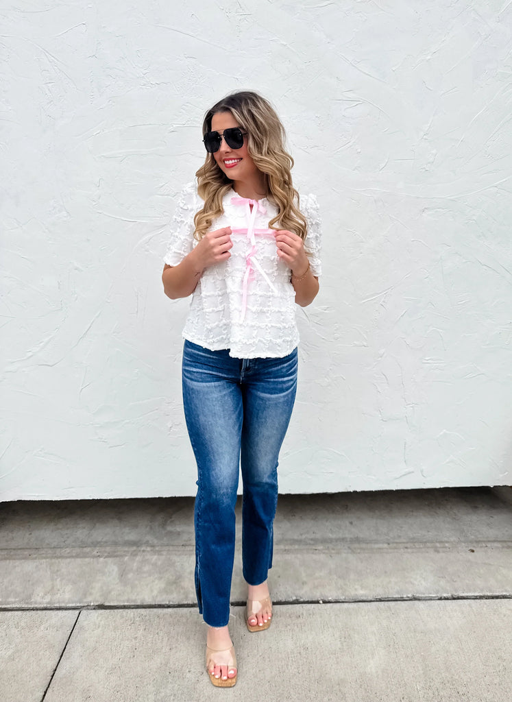 The cutest stretchy, high-quality fabric with the daintiest bow front neckline! Babydoll fit with a slight bubble sleeve. You're going to love these!